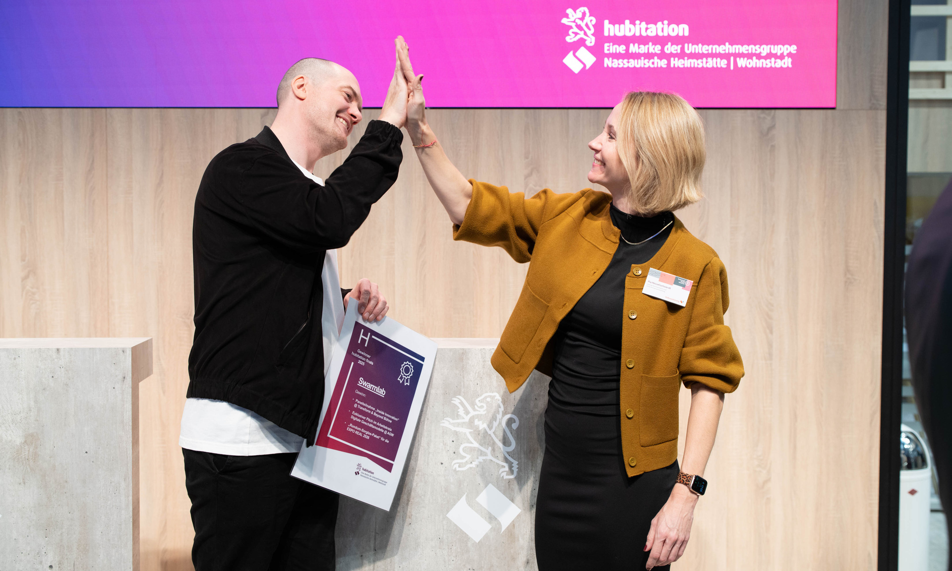 Frieda: Ein klares Ja in Capital Letters. Auf jeden Fall wäre es an der Zeit, mehr Startups zuzulassen, die nicht nur das klassische Immobilienportfolio oder den klassischen Immobilienzyklus bedienen. Das ist auch der Grund, warum viele Startups nicht zugelassen wurden, weil sie, zumindest ist das die Begründung der Messe, nicht in die Nomenklatur passen. Ich halte das für ein schwieriges Signal, weil ich glaube, dass ganz viele innovative Lösungen da draußen sind. Und der Kontakt muss ja irgendwie hergestellt werden zwischen der Branche und diesen Startups. Da die Expo auch für Vernetzung steht, denke ich, dass das eine verpasste Chance gerade zu diesem Zeitpunkt ist. Ich bin gespannt, ob im nächsten Jahr eine Veränderung kommt. Umso wichtiger ist es, dass wir mit hubitation unsere finals dort austragen, Startups mit uns auf die Bühne kommen und ihr Pilotprojekt vorstellen. Es ist also nicht das klassische Pitchdeck, sondern es geht darum, dass das Startup, das mit der NHW zusammenarbeitet, ein Pilotprojekt vorstellt. Ich denke, es müsste mehr Startups auf der Messe geben, und zwar nicht in der letzten Halle mit kleinen Ständen. Außerdem bin ich überzeugt davon, dass die alle eine Bühne brauchen, auf der es noch mehr um das Produkt und das Zusammenfinden zwischen Branche und Startups geht.