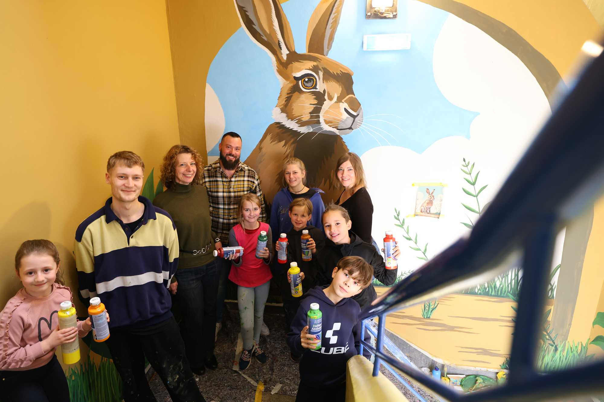 Drei Tage malen mit Pinsel und Wandfarbe und schon hat das Treppenhaus im Jugendzentrum Kassel-Hasenhecke eine ganz andere Ausstrahlung. „Es war den Kids einfach zu dunkel und zu hässlich. Und sie wünschten sich, die Wände selbst zu verschönern“, so NHW-Projektmanagerin Jennifer Linke. Mit Unterstützung des Kasseler Künstlerduos Sandana Design und finanziert durch die NHW entstand ein Wandkunstwerk mit wachsam blickendem Hasen vor saftig grüner Graslandschaft. Alle sind begeistert von diesem tollen Hingucker, der zeigt, wie nachhaltige Quartiersentwicklung und kreative Beteiligung Hand in Hand gehen.