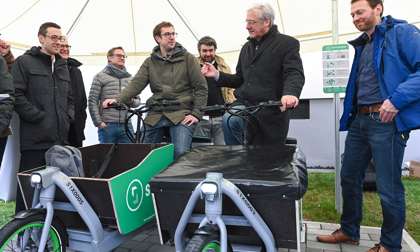 Großeinkäufe nach Hause transportieren, die Kinder aus der Kita abholen: Die Bewohner des NHW-Quartiers in der Eichbergstraße in Darmstadt – aber auch alle anderen Interessierten – können solche Tätigkeiten jetzt bequem mit dem E-Lastenrad erledigen. Die NHW hat dem Anbieter sigo GmbH die Fläche für zwei Bikes und die dazugehörige Ladeinfrastruktur zur Verfügung gestellt, vor wenigen Tagen wurde das umweltschonende Angebot der Öffentlichkeit präsentiert. Einer der Ersten, die sich auf ein E-Lastenrad setzte, war Darmstadts OB Jochen Partsch.
