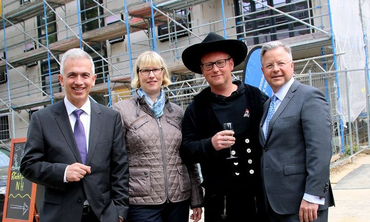 Frankfurt/Main: Aktuell entstehen in Unterliederbach – im Quartier „Engelsruhe“ – zwei neue Mehrfamilienhäuser mit 35 Mietwohnungen. Am Mittwoch (2. Mai) feierten Geschäftsführerin Monika Fontaine-Kretschmer und Frankfurts Oberbürgermeister Peter Feldmann gemeinsam mit den am Bau beteiligten Firmen und Gästen aus der Kommunalpolitik und der Nachbarschaft das Richtfest. „Diese Quartiersergänzung mit modernen Neubauten ist ein kleiner Baustein unseres umfangreichen Investitionsprogramms im Wohnungsbau. Aber aus kleinen Steinen entsteht am Ende bekanntlich das große Mosaik – und das zeigt 4.900 neue Wohnungen in den nächsten fünf Jahren, viele davon in Frankfurt und der allergrößte Teil preiswerte Mietwohnungen“, sagte Fontaine-Kretschmer zur Begrüßung der Gäste. OB Feldmann betonte: „Das Überzeugende an diesem Projekt ist, dass hier ein interessanter Mix aus kleinen und großen Wohnungen entsteht, der für alle Alters- und Familienstrukturen geeignet ist. Zudem nutzt die Nassauische Heimstätte eigenen Grund und Boden und kann so schneller den in Frankfurt dringend benötigten Mietwohnungsbau realisieren. Für solche Quartiersergänzungen spricht auch: Die neuen Bewohner kommen in gewachsenen Strukturen und funktionierenden Nachbarschaften an.“
