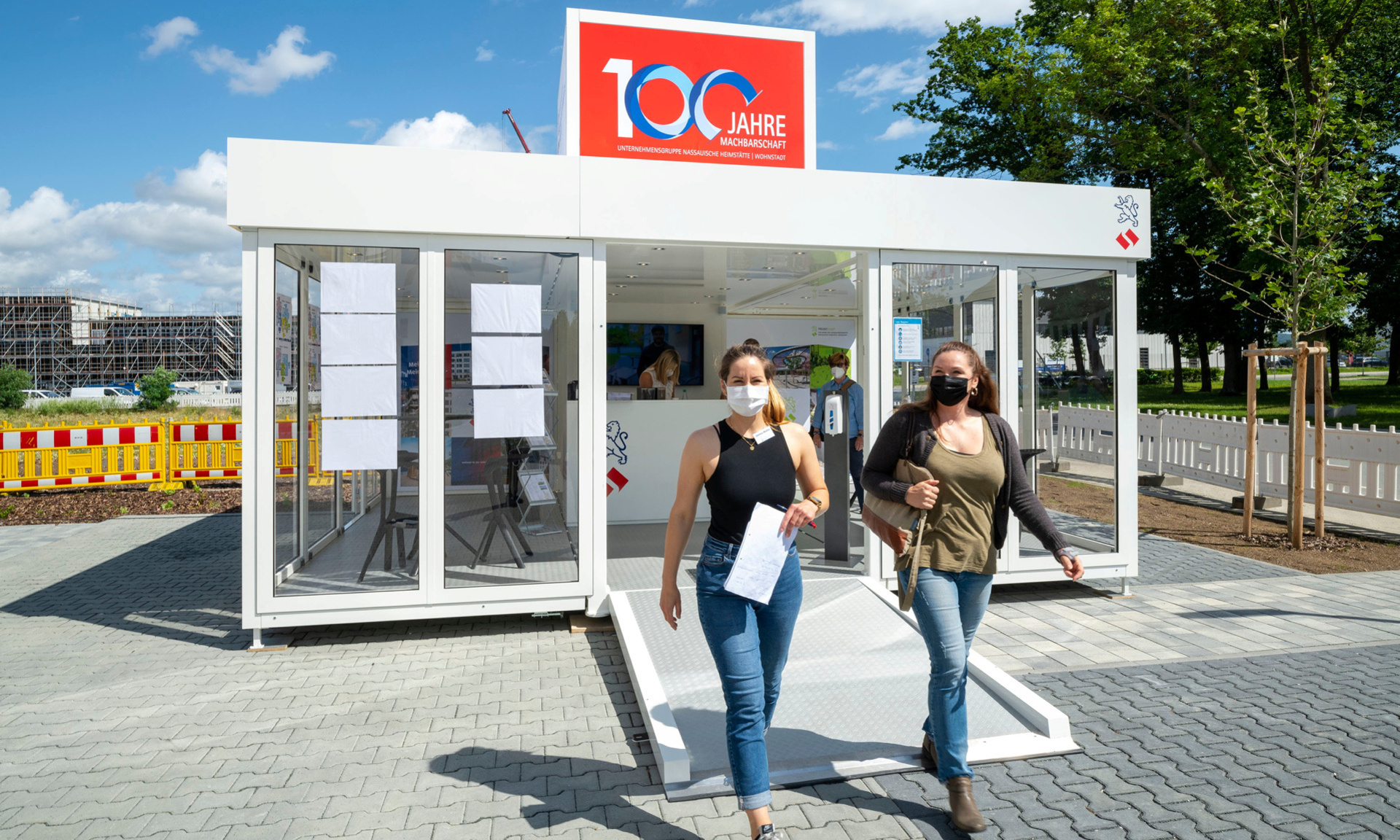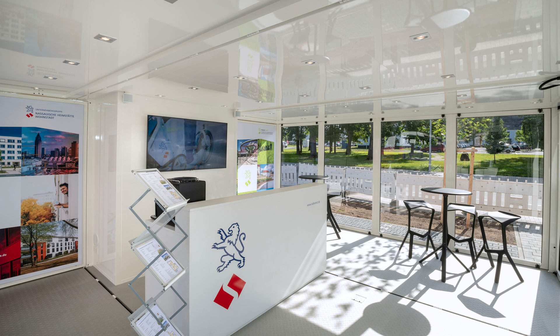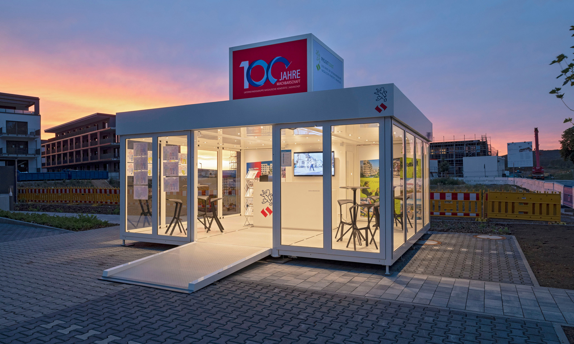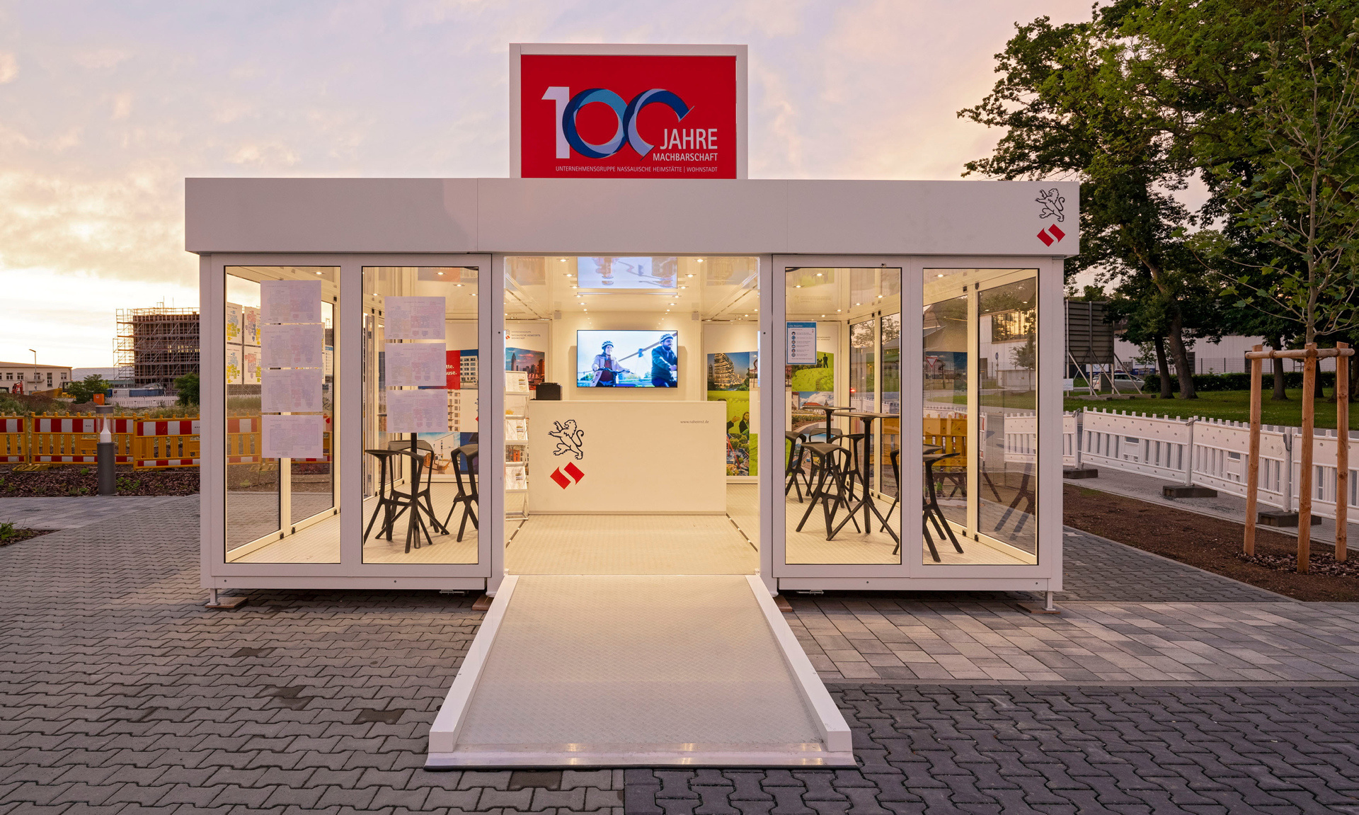 Quadratisch? Ist er nicht. Praktisch? Auf jeden Fall. Gut? Selbstverständlich. Die NHW hat während der Feierlichkeiten zu ihrem 100-jährigen Bestehen auch den Info-Cube im Einsatz. Der Cube ist ein mobiles und flexibles Infotainment-Instrument, das im Rahmen von Projekten vor Ort genutzt werden kann. Premiere hatte der 30 Quadratmeter große, lichtdurchflutete Info-Würfel bei unserem Neubauprojekt "Am Alten Flughafen" in Gießen. Vom 5. bis 7. Juli 2021 haben wir allen Interessierten live vor Ort unsere neuen Wohnprojekte vorgestellt, sie in ansprechender Atmosphäre beraten und Wohnungsbesichtigungen angeboten.