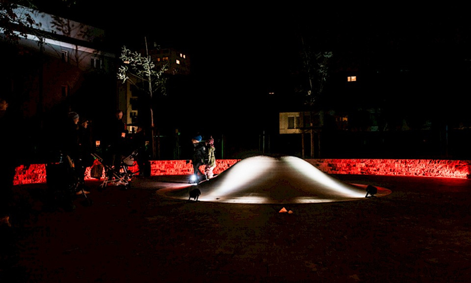 Der Spielplatz in der Johannes-Morhart-Straße im Offenbacher Nordend ist mit rund 3.300 Quadratmetern einer der größten der Stadt – und nachts ein dunkler Raum. Für die diesjährige Luminale erstrahlt er nun einen Abend in den Farben Rot, Blau, Grün, Gelb, Türkis sowie Weiß und wird zum Begegnungsort zwischen Jugendlichen des Stadtteils und Besuchern. Kern des Abends ist die Aufführung einer Leucht-Choreographie, die Jugendchoreografin Therès Hauser und Kommunikationskünstlerin Gabriele Juvan mit Jugendlichen des Nordends in einem mehrwöchigen Workshop erarbeitet haben. Zu sehen sind Bewegungsformen wie Parcours, Break oder Sport und Lichtbilder, die mit Hilfe von Taschenlampen, Laserpointern oder Schatten entstehen. Die Musik dazu stammt von DENIZ, ebenfalls ein Jugendlicher aus der Nachbarschaft.