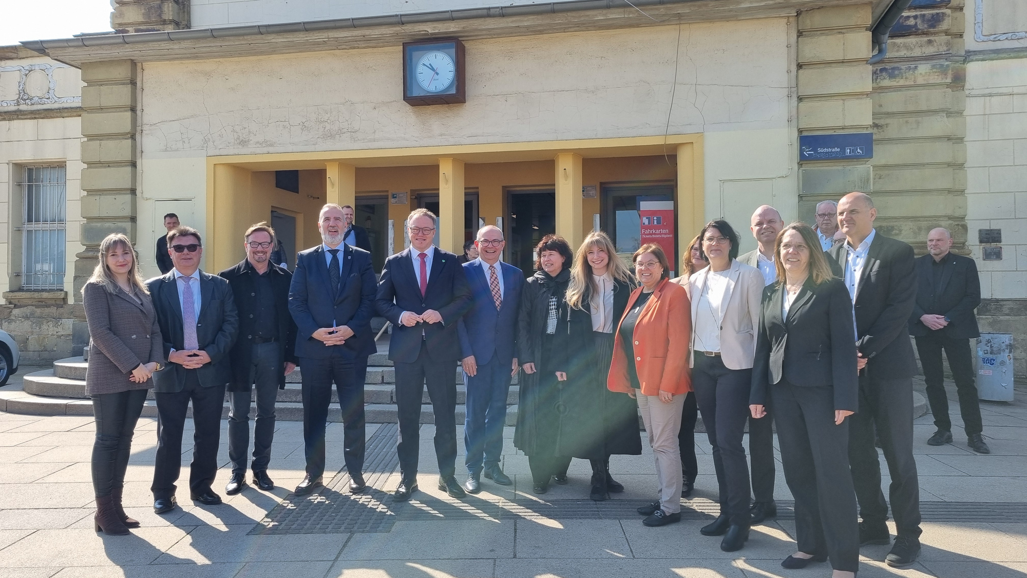 (v.li.) Natalie Reichenbach, Falk Wenzel (beide Thüringer Landesverwaltungsamt), Axel Berthold (ProjektStadt), Steffen Schütz (Thüringer Minister für Digitales und Infrastruktur), Mario Voigt (Ministerpräsident des Freistaates Thüringen), Knut Kreuch (Oberbürgermeister Stadt Gotha), Alice Dinger (ProjektStadt), Bärbel Ernst (Stadt Gotha), Christina Kromke (Leiterin Bahnhofsmanagement Erfurt), Sabine Funke und Andrea Bieber (beide Baumanagement BGG Gotha).
