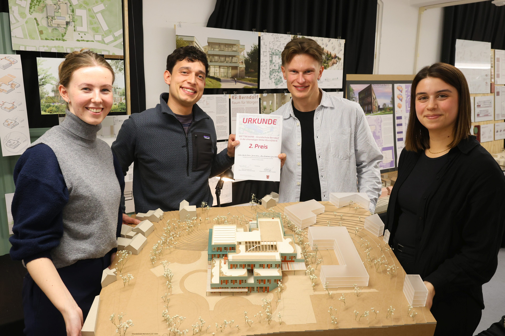 Platz 1: (v. li.) Janka Schumann, Timon Paul Türk. Tom Stehmann und Elina Marie Klett halten ein Modell ihres Entwurfs in ihren Händen