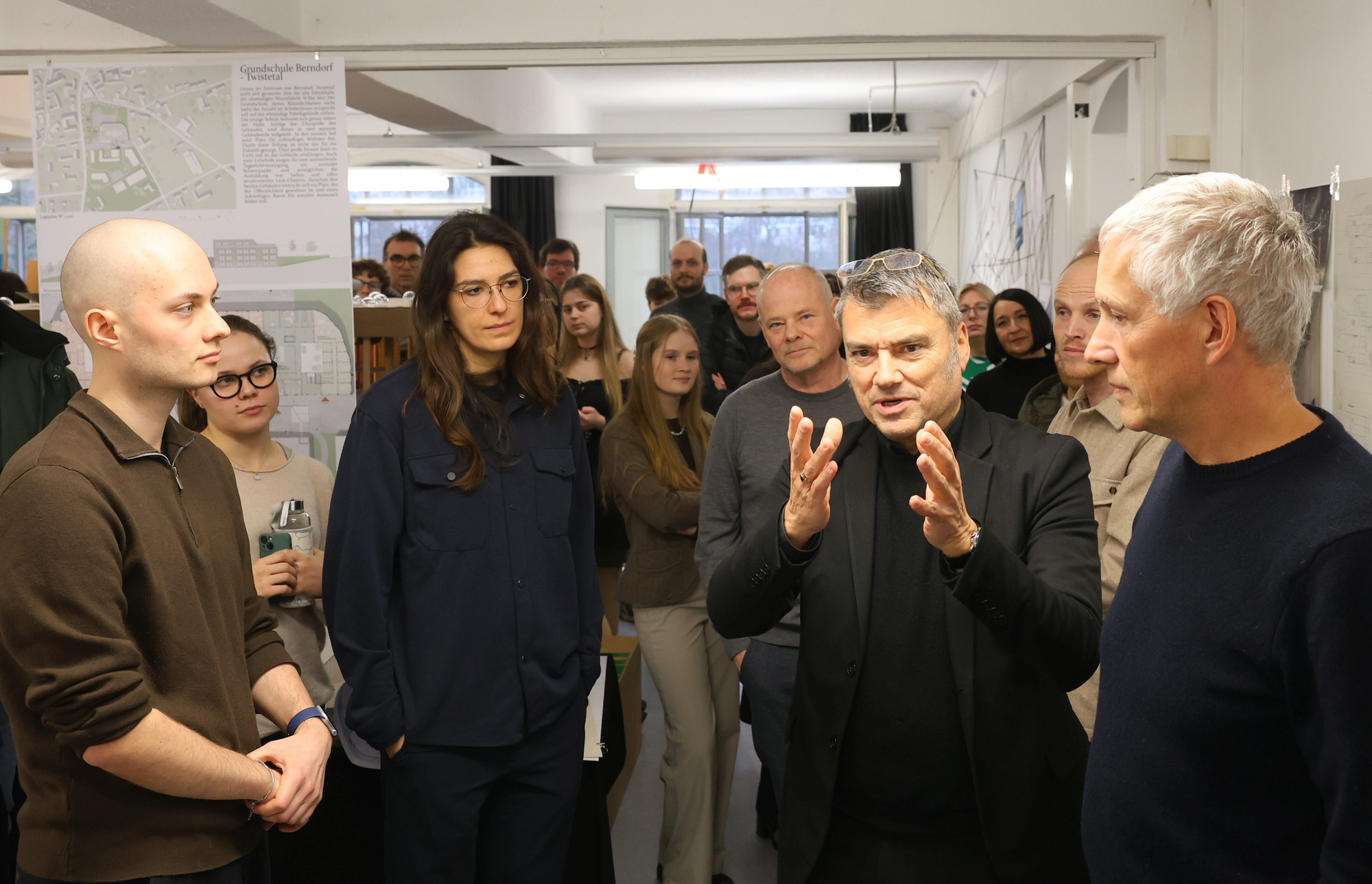 Bereits im November 2025 konnten sich 37 Studierende bei einem Ortstermin ein Bild von den räumlichen und städtebaulichen Gegebenheiten machen. Die Eindrücke aus dem „Betonklotz“, wie Bürgermeister Friedrich Vogel das Gebäude nannte, flossen direkt in die Entwürfe ein.