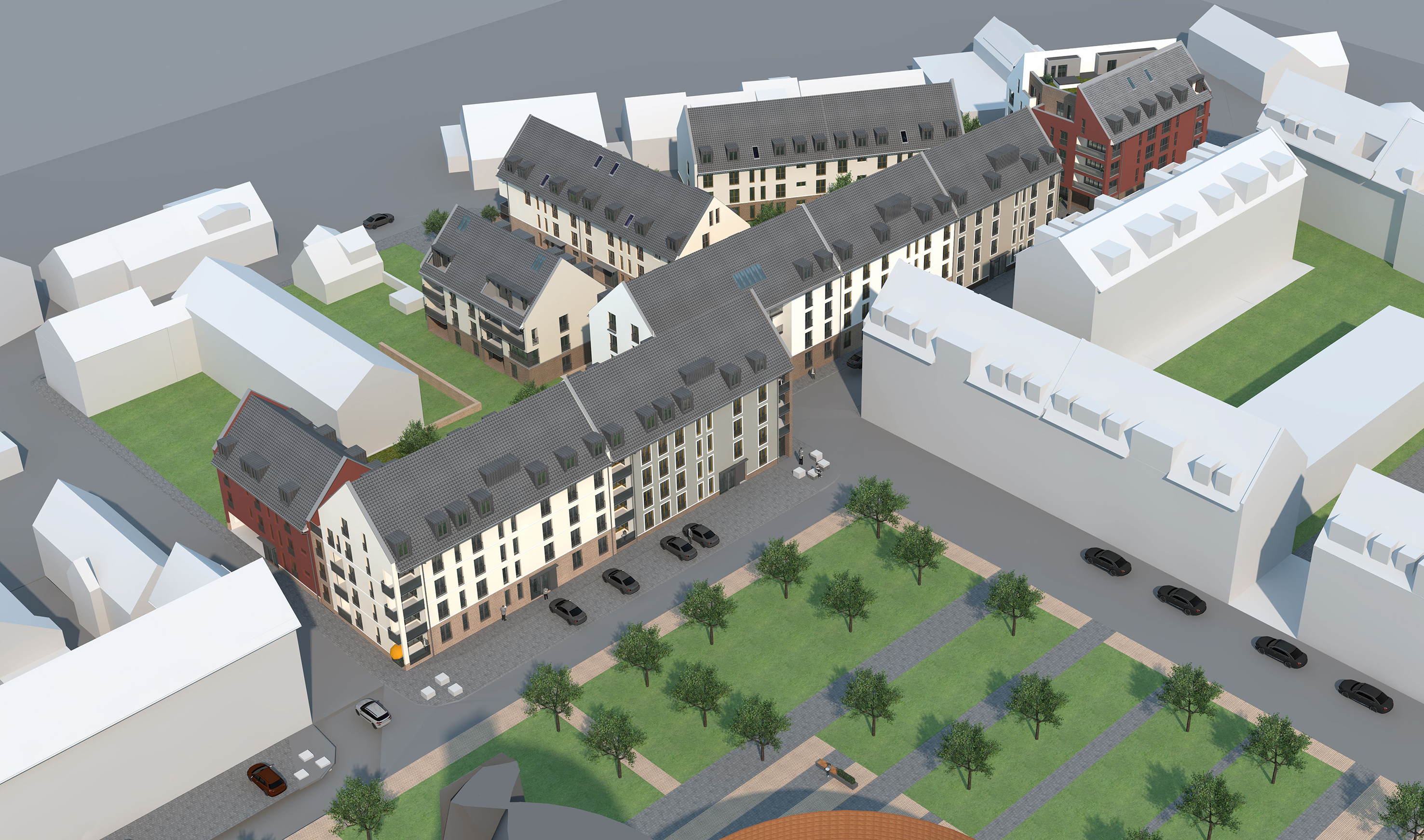 Dem historischen Grundriss der Stadt Hanau entsprechend werden die neuen Gebäude in Form einer Blockrandbebauung errichtet. Entlang der Hahnenstraße sind vier Geschosse vorgesehen, entlang der Gärtner- und der Karl-Röttelberg-Straße jeweils drei Geschosse. Rund 370 qm sind drei Gewerbeeinheiten vorbehalten. Zwei davon sind im Erdgeschoss des markanten Kopfbaus zur Steinheimer Straße hin geplant, eventuell in Form eines Nahversorgers. In den einzelnen Häusern werden zwischen sieben und 23 Wohnungen untergebracht. Insgesamt entstehen 17 Ein-Zimmer-, 86 Zwei-Zimmer-, 45 Drei-Zimmer- und acht Vier-Zimmer-Wohnungen mit einer Grundfläche von zwischen ca. 45 und 105 qm. 20 Prozent davon sollen im Rahmen des geförderten Wohnungsbaus angeboten werden. Die Miete wird im freifinanzierten Bereich zwischen ca. neun und ca. elf Euro pro Quadratmeter und Monat liegen, im geförderten Bereich bei rund 6,60 Euro. Alle Wohnungen verfügen über einen Balkon, im Erdgeschoss als Terrasse mit Gartenanteil, im Dachgeschoss in Form von Dachterrassen.