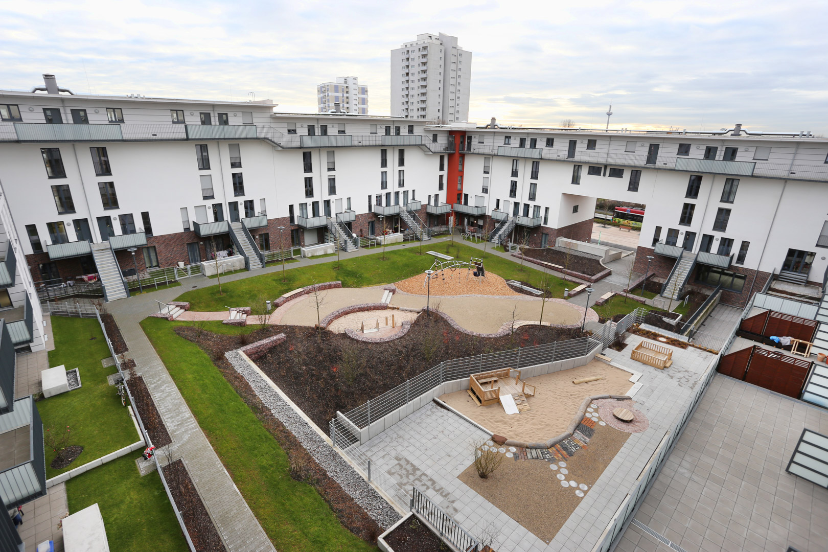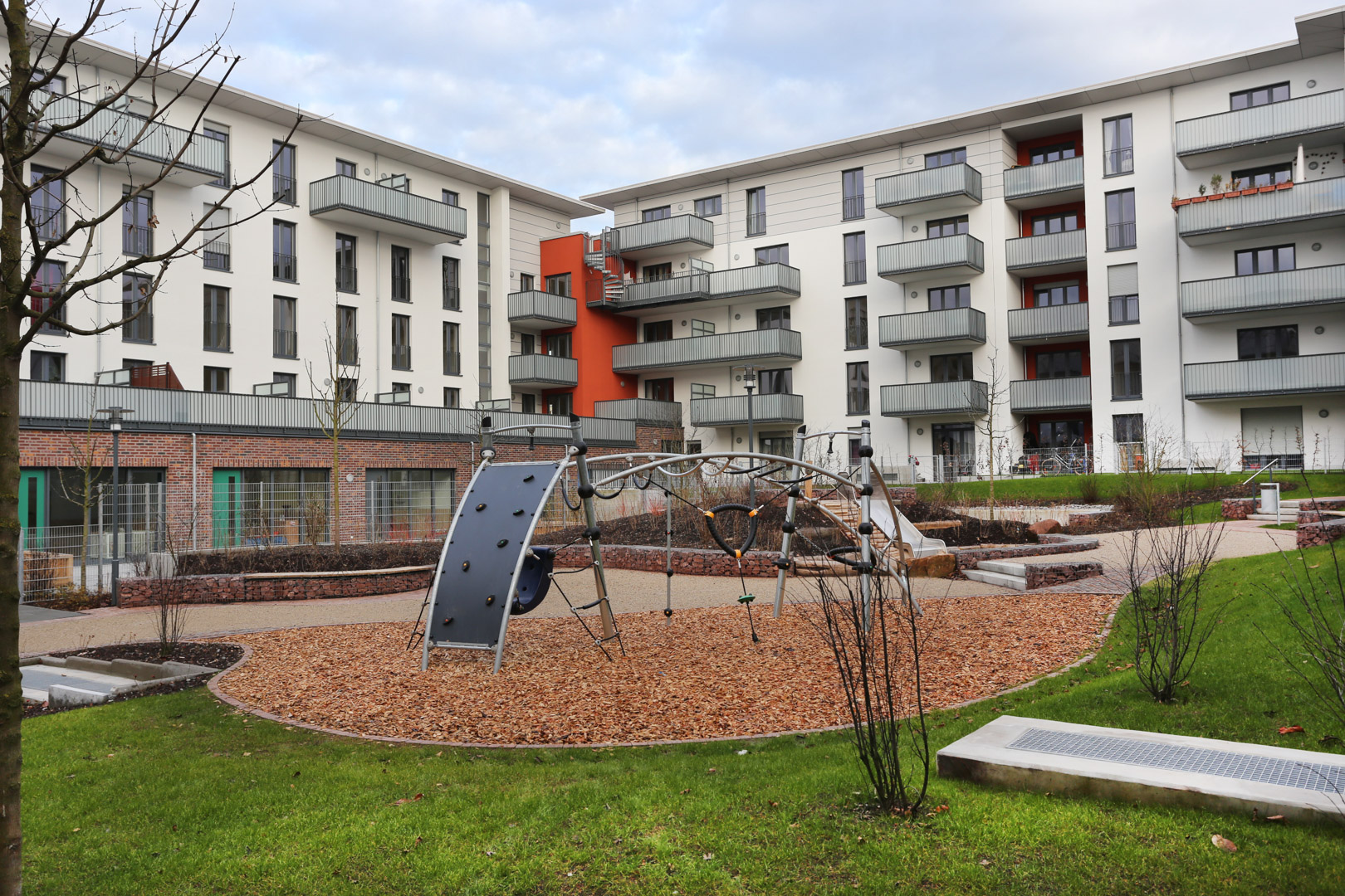 | Planungskonzept | Attraktive Blockrandbebauung mit vier Vollgeschossen und einem Staffelgeschoss, die im Innenbereich großzügige Grün- und Spielflächen, Mietergärten und Kommunikationszonen mit hoher Aufenthaltsqualität anbietet – ganz im Sinne einer funktionierenden Nachbarschaft. Im nördlichen, westlichen und südlichen Baukörper sind ab dem 1. Obergeschoss Maisonettwohnungen angeordnet. Sie werden entweder über separate Außentreppen vom Innenhof oder über 4 Haupttreppenhäuser und Aufzüge in den Gebäudeecken und den daran angegliederten Laubengängen erschlossen. Die barrierefreien Erdgeschosswohnungen unter den Maisonetten haben in der Regel einen eigenen Eingang von der Straße. Der Baukörper im Osten besteht aus einem Zwei- und einem Dreispänner für Etagenwohnungen mit separaten Treppenhäusern und Aufzügen. |
