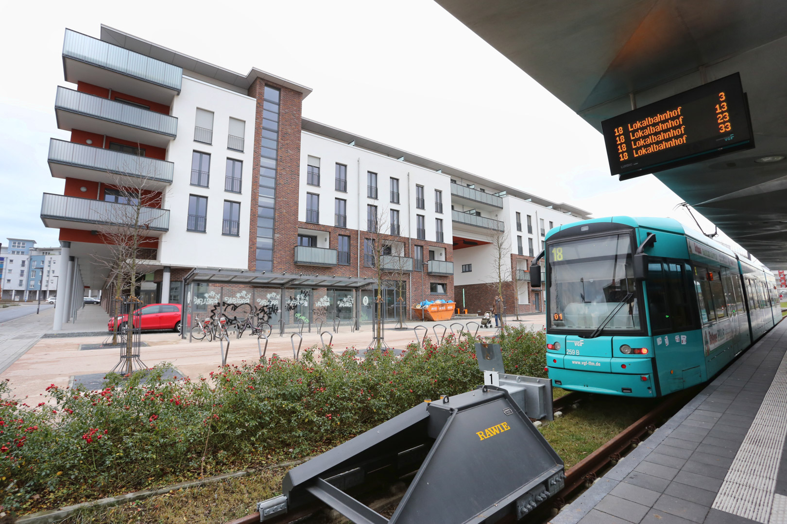 | Umfeld | Das Grundstück liegt am Rande des Gravensteiner Platzes, dem Zentrum des Stadtquartiers und Endhaltestelle einer neuen Straßenbahn- und einer Buslinie. An zwei Seiten grenzt es an eine Fußgängerzone, an der sich der Wochenmarkt und ein Einkaufszentrum befinden. Schulen, Kindergärten sind fußläufig zu erreichen, eine Kita sogar im EG vorhanden. Der Freizeitwert ist nicht nur durch den freien Blick von den oberen Wohnungen auf den Taunus groß, auch die Umgebung bietet viel Grün in der Natur. |