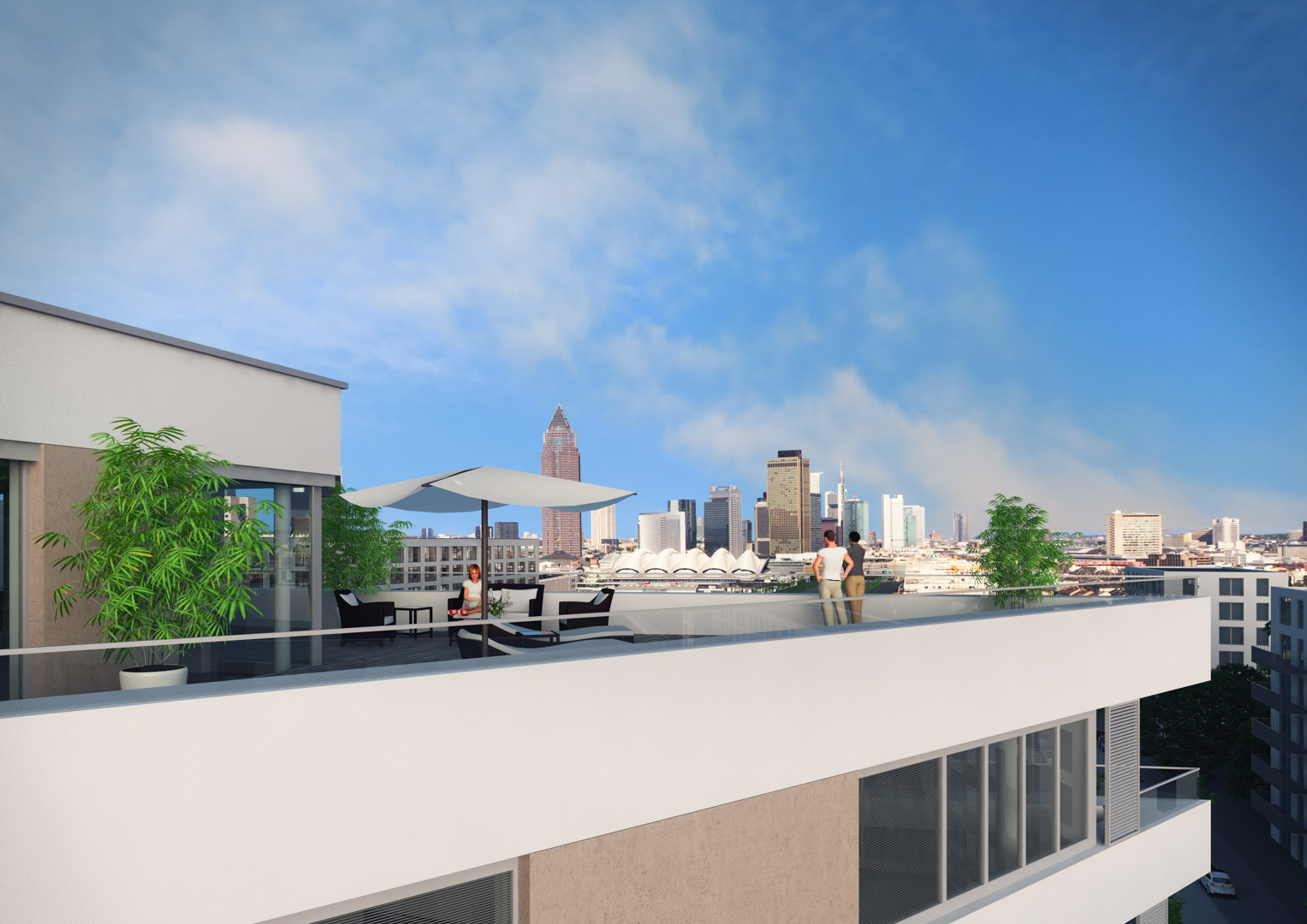 PRAEDIUM, Frankfurt: Modern urbanes Wohnen – Das Wohnhochhaus verfügt insbesondere mit den Blickbeziehungen aus den oberen Etagen über ein Alleinstellungsmerkmal, mit dem Zielgruppen exklusiv angesprochen werden können.