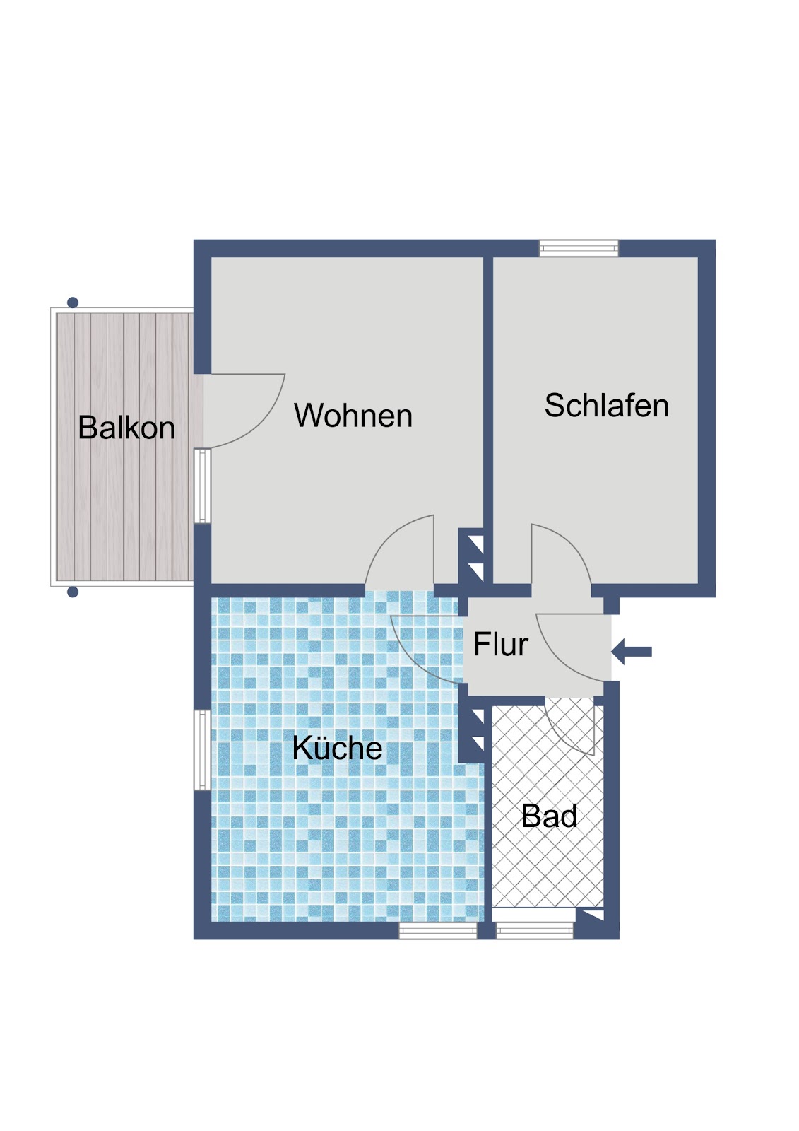 Der Flur verbindet die einzelnen Räume der Wohnung sinnvoll miteinander. Das Wohnzimmer bietet ausreichend Platz für einen komfortablen Wohnbereich und verfügt über den Zugang zu einem Balkon, der den Wohnraum nach außen erweitert und eine angenehme Möglichkeit zum Aufenthalt im Freien schafft. Das Schlafzimmer eignet sich gut als ruhiger Rückzugsort. Die Küche ist neutral und funktional gestaltet und eignet sich für die tägliche Zubereitung von Mahlzeiten. Das Badezimmer ist mit einer Badewanne ausgestattet. Ein Kellerraum steht als zusätzlicher Stauraum zur Verfügung und bietet Platz für Gegenstände, die nicht täglich benötigt werden. In der Wohnung ist ein Linoleumboden verlegt, der sich pflegeleicht im Alltag nutzen lässt.
