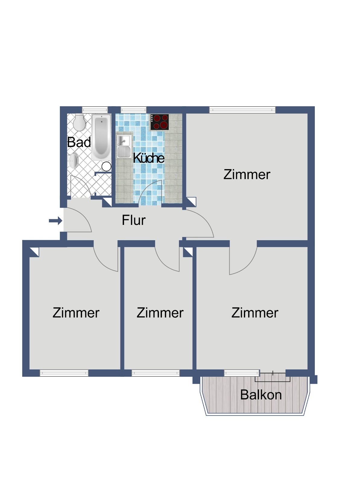 Helle und gut geschnittene Wohnräume sind vom zentral gelegenen Flur zu erreichen. Sie bieten Platz für Ihre Möbel und können mit wenigen Handgriffen und ein wenig Dekorationsgeschick schnell in ein gemütliches Zuhause verwandelt werden.