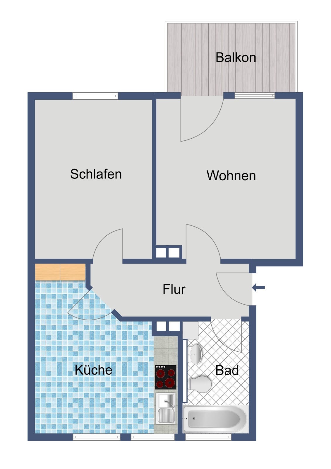 Die Wohnküche dient als Durchgangszimmer. Von hier aus erreichen Sie das potenzielle Schlafzimmer.