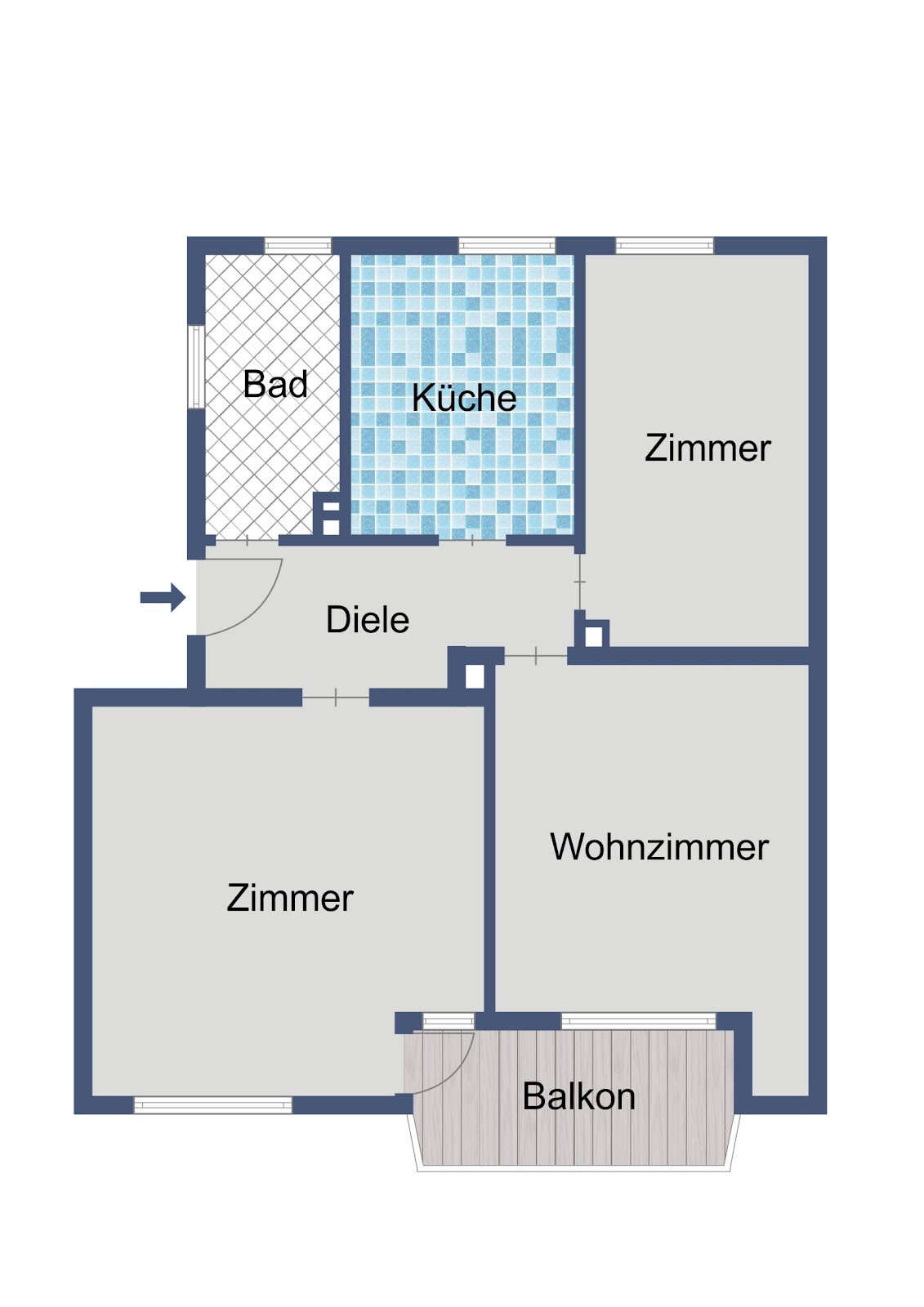 Die Wohnung überzeugt durch eine praktische Aufteilung mit einem hellen Wohnzimmer als Mittelpunkt, von dem aus Sie auf den Balkon gelangen, der zusätzlichen Freiraum im Außenbereich bietet. Das Schlafzimmer bietet ausreichend Platz für ein Doppelbett und Stauraum, während das dritte Zimmer flexibel als Kinderzimmer, Arbeitszimmer oder Gästezimmer genutzt werden kann. Die Küche ist separat angeordnet und ermöglicht eine funktionale Gestaltung nach Ihren eigenen Vorstellungen. Das Badezimmer ist mit einer Badewanne ausgestattet. Ein Flur verbindet die einzelnen Räume sinnvoll miteinander und schafft eine klare Trennung von Wohn- und Schlafbereich.