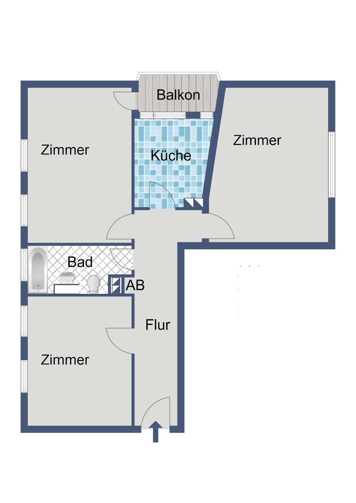 Vom zentralen Flur aus sind alle Räume direkt erreichbar. Der helle Wohnbereich mit dem Zugang zum Balkon stellt das kommunikative Herz der Wohnung dar. Zwei weitere große Räume können indiduell genutzt werden.