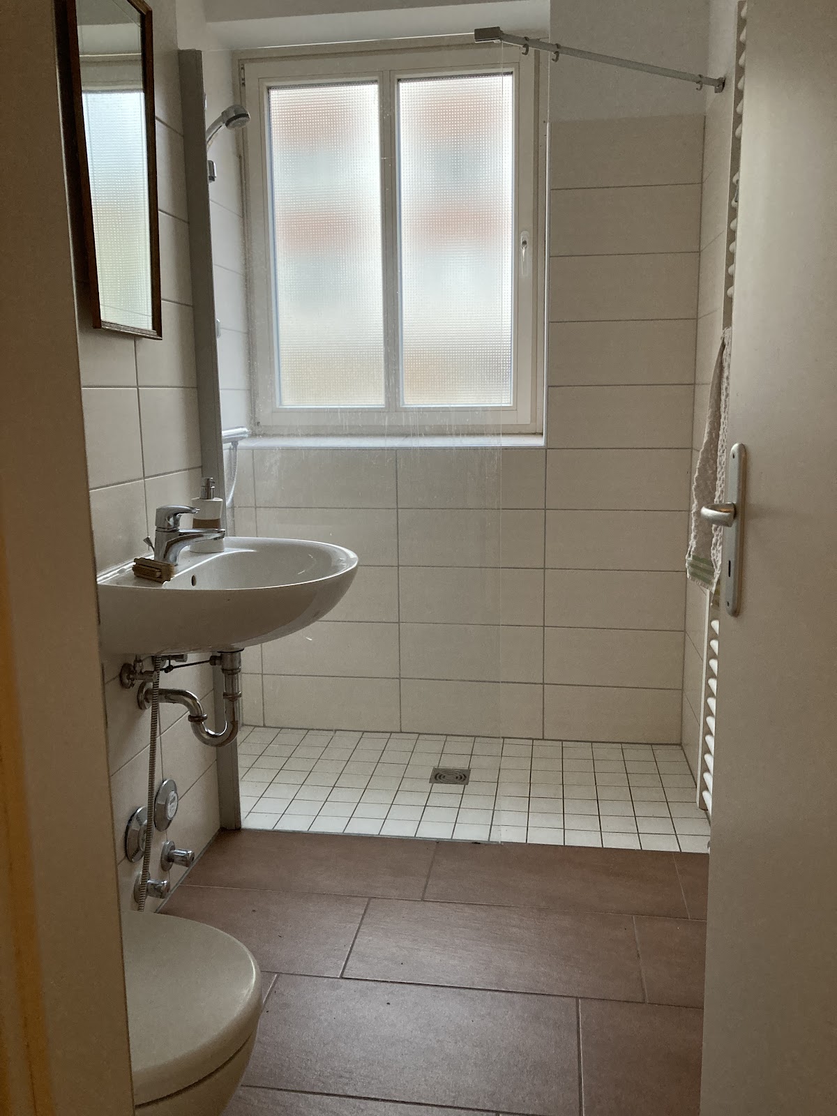 Das Badezimmer mit Fenster verfügt über eine Dusche und bietet ausreichend Platz für die tägliche Nutzung. Der Waschmaschinenanschluss befindet sich im Keller. Der Flur sorgt für eine angenehme Verbindung aller Wohnbereiche.
