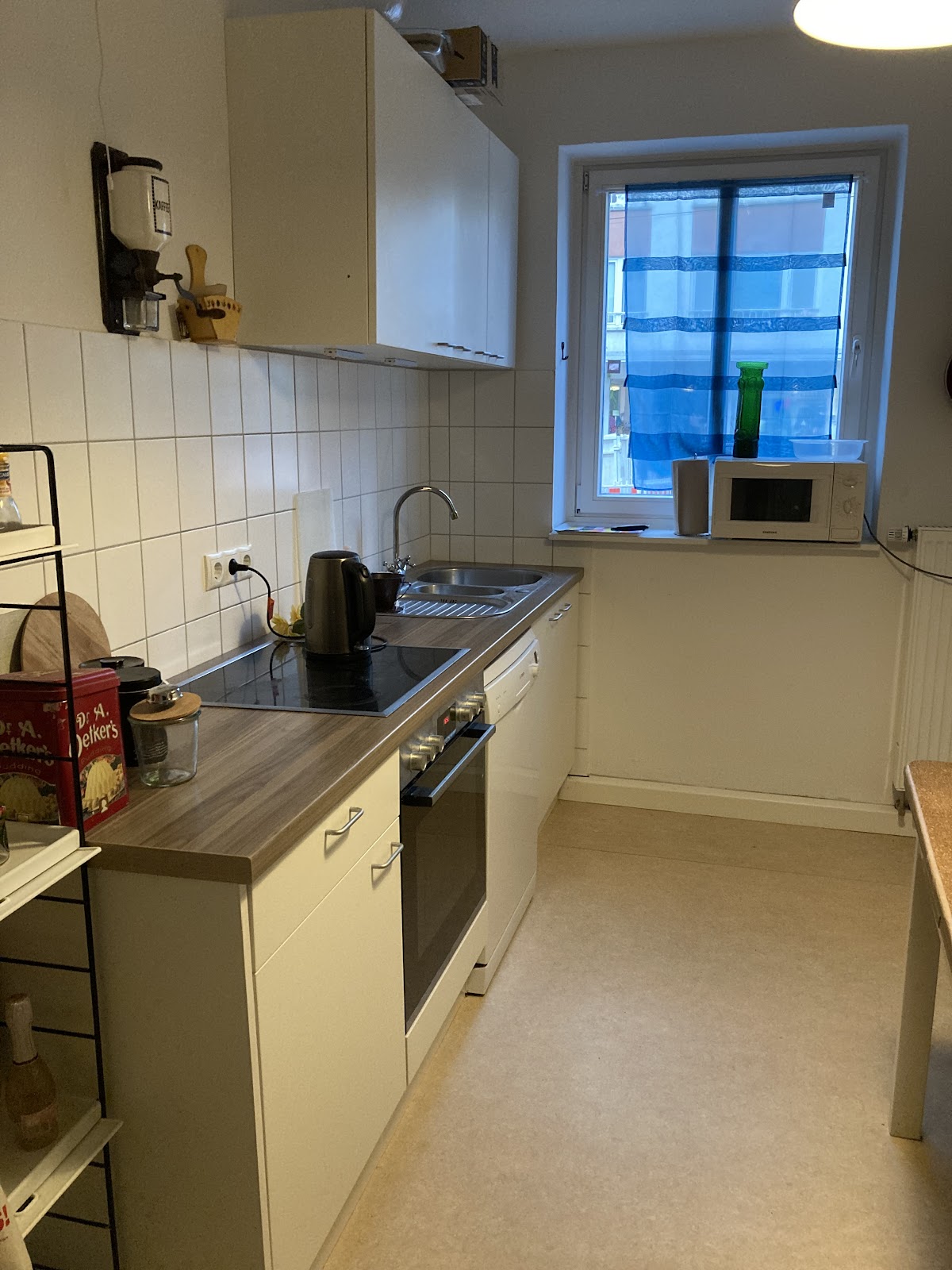 Das schöne Wohnzimmer bildet den Mittelpunkt der Wohnung und bietet direkten Zugang auf den Balkon, der zusätzlichen Freiraum zum grünen Innenhof ermöglicht. Das Schlafzimmer überzeugt durch eine angenehme Größe und schafft einen ruhigen Rückzugsort. Ein weiteres Zimmer eignet sich ideal als Arbeits- oder Gästezimmer und rundet die flexible Nutzung der Wohnung ab. Die Küche ist mit einer Einbauküche ausgestattet, die gegen Abschlag vom Vormieter übernommen werden kann.