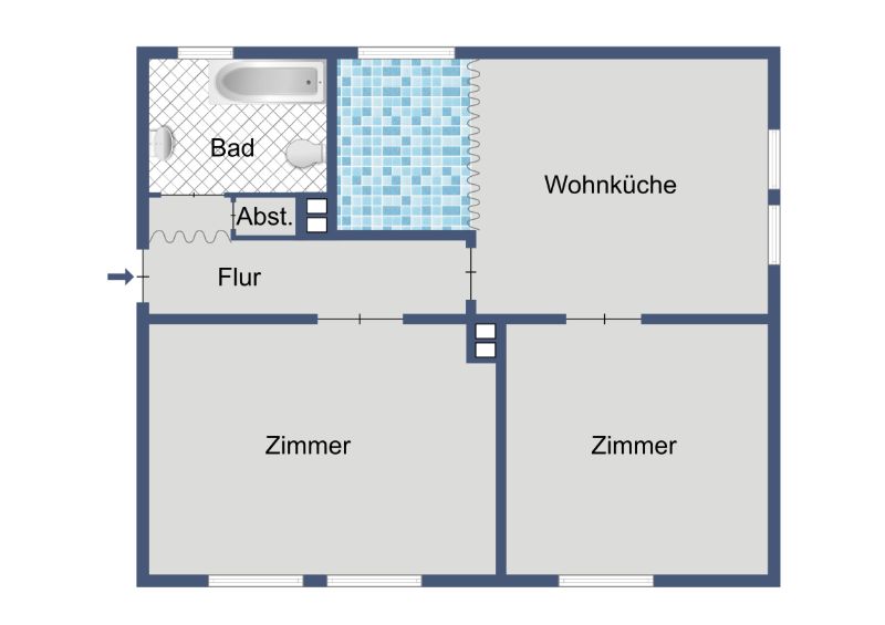 Beim Betreten der Wohnung gelangen Sie in einen zweckmäßig geschnittenen Flur, von dem aus alle weiteren Räume erreichbar sind. Das Wohnzimmer dient als zentraler Aufenthaltsbereich und bietet Platz für eine gemütliche Sofaecke sowie einen kleinen Essbereich. Das Schlafzimmer ist als ruhiger Rückzugsort angelegt und bietet geeignete Stellflächen für ein Bett und einen Kleiderschrank. Die Küche ist separat angeordnet und für den täglichen Gebrauch gut nutzbar; die vorhandene Einbauküche kann bei Bedarf von der aktuellen Mietpartei übernommen werden. Das Badezimmer ist mit einer Badewanne ausgestattet und bietet eine komfortable Grundausstattung für den Alltag. Ein zur Wohnung gehörender Kellerraum sorgt für zusätzlichen Stauraum, etwa für saisonale Gegenstände oder selten genutzte Utensilien. Ein Balkon ist nicht vorhanden.