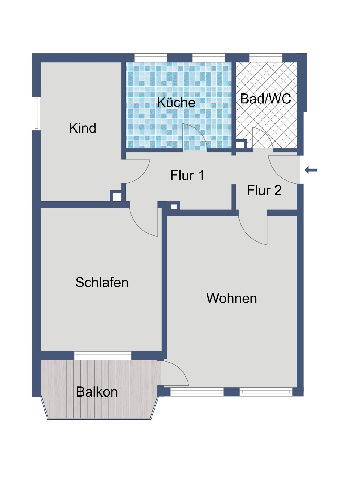 Das Wohnzimmer bietet ausreichend Platz für einen komfortablen Wohnbereich und kann gut mit einem Essbereich kombiniert werden. Das Schlafzimmer ist für ein Doppelbett und zusätzlichen Stauraum geeignet. Ein weiteres Zimmer kann flexibel als Kinderzimmer, Arbeitszimmer oder Gästezimmer genutzt werden. Die Küche bietet Platz für eine funktionale Einbauküche und die notwendigen Elektrogeräte. Das Tageslichtbad ist mit einer Badewanne ausgestattet. Ein Balkon ergänzt das Raumangebot und schafft zusätzlichen Freiraum im Außenbereich.