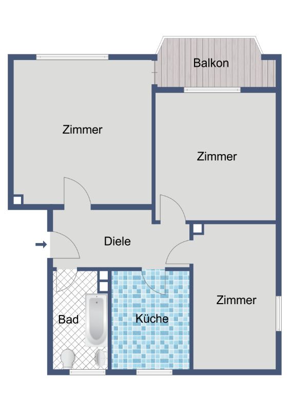 Die Wohnung umfasst ein Wohnzimmer, zwei weitere Zimmer, eine Küche, ein Badezimmer sowie einen Flur. Das Wohnzimmer bildet den Mittelpunkt der Wohnung und lässt sich als angenehmer Aufenthaltsbereich gestalten. Die beiden weiteren Zimmer eignen sich je nach Bedarf als Schlafzimmer, Kinderzimmer oder Arbeitszimmer und bieten damit eine flexible Nutzung. Die Küche bietet Platz für Ihre Kücheneinrichtung und eine praktische Alltagsgestaltung. Das Badezimmer ist mit einer Badewanne ausgestattet. Ein Balkon erweitert den Wohnbereich nach außen und schafft zusätzlichen Raum für erholsame Momente im Freien.