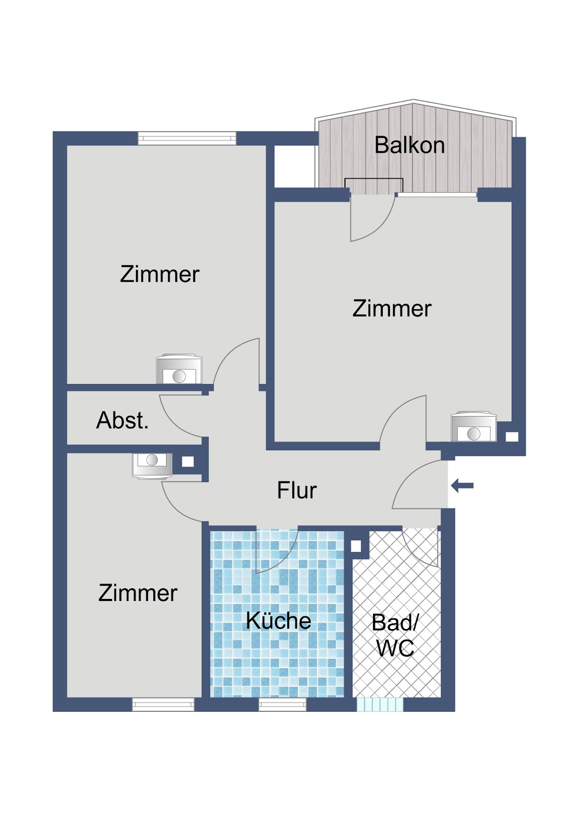 Der zentrale Flur verbindet alle Räume der Wohnung und sorgt für eine übersichtliche und praktische Aufteilung. Das Wohnzimmer ist großzügig bemessen und bietet ausreichend Platz für einen gemütlichen Wohn- und Essbereich. Von hier aus gelangen Sie auf den Balkon, der zusätzlichen Freiraum im Außenbereich schafft und sich ideal für eine kleine Sitzgruppe oder Pflanzen eignet. Das Schlafzimmer bietet genügend Stellfläche für ein Doppelbett und einen Kleiderschrank und dient als ruhiger Rückzugsort. Ein weiteres Zimmer kann flexibel als Kinderzimmer, Arbeitszimmer oder Gästezimmer genutzt werden und macht die Wohnung vielseitig nutzbar. Die Küche ist separat angeordnet und lässt sich funktional einrichten, sodass der Kochbereich klar vom Wohn- und Essbereich getrennt ist. Das Badezimmer ist mit einer Badewanne ausgestattet und verfügt über alle notwendigen Sanitärelemente für den täglichen Komfort.