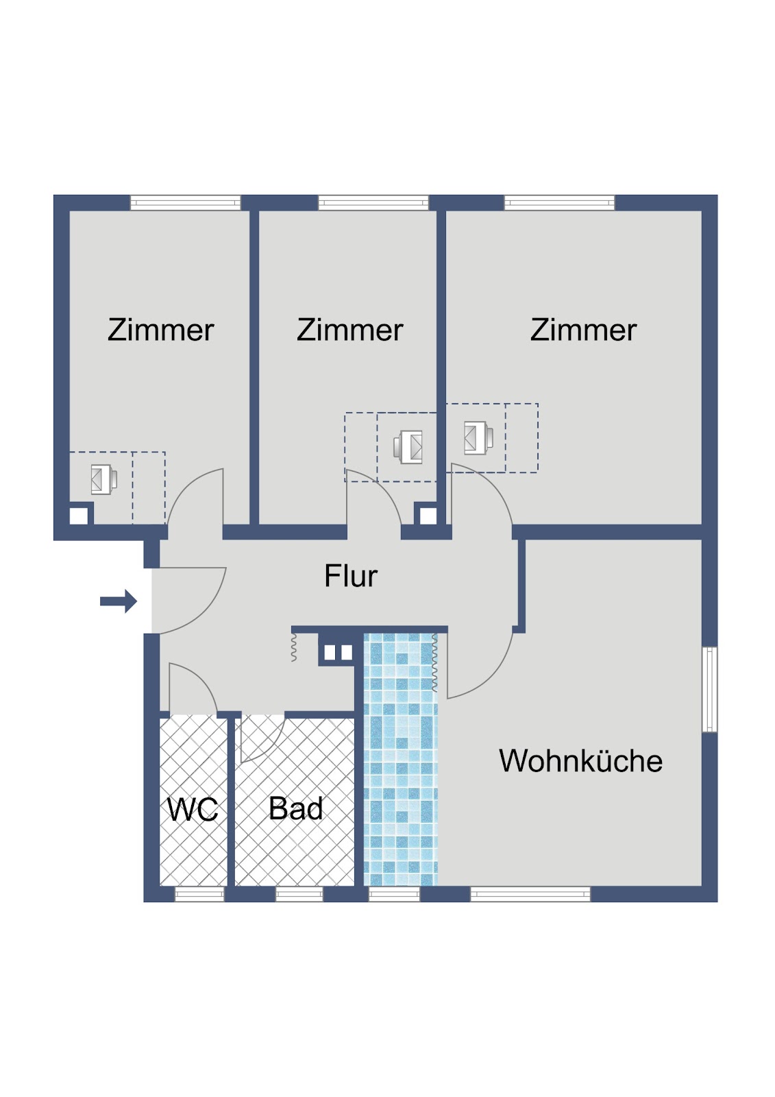 Hier bieten wir Ihnen eine 3-Zimmer-Wohnung im 1. Obergeschoss eines gepflegten Mehrfamilienhauses. Beim Betreten empfangen Sie helle und freundliche Räume.