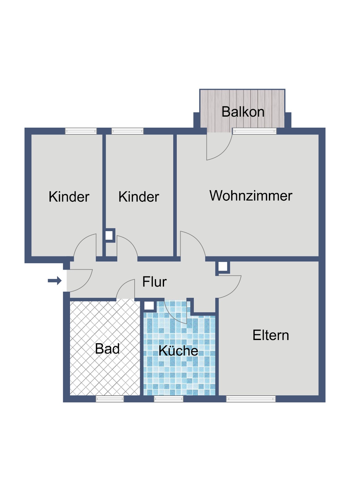Der gut geschnittene Flur verbindet alle Räume miteinander und sorgt für eine klare Struktur innerhalb der Wohnung. Das Wohnzimmer bildet den Mittelpunkt und bietet ausreichend Platz für einen gemütlichen Wohn- und Essbereich. Von hier aus gelangen Sie auf den Balkon, der zusätzlichen Freiraum im Außenbereich schafft und den Wohnkomfort spürbar erhöht. Das Schlafzimmer ist zweckmäßig dimensioniert und eignet sich ideal als ruhiger Rückzugsort. Die beiden weiteren Zimmer können flexibel als Kinderzimmer, Arbeitszimmer oder Gästezimmer genutzt werden und machen die Wohnung besonders attraktiv für eine Familie. Die Küche ist separat angeordnet und lässt sich funktional einrichten, sodass der Kochbereich klar vom Wohnbereich getrennt ist. Das Badezimmer ist mit einer Badewanne und einer Dusche ausgestattet und verfügt über alle notwendigen Sanitärelemente für den täglichen Komfort.
