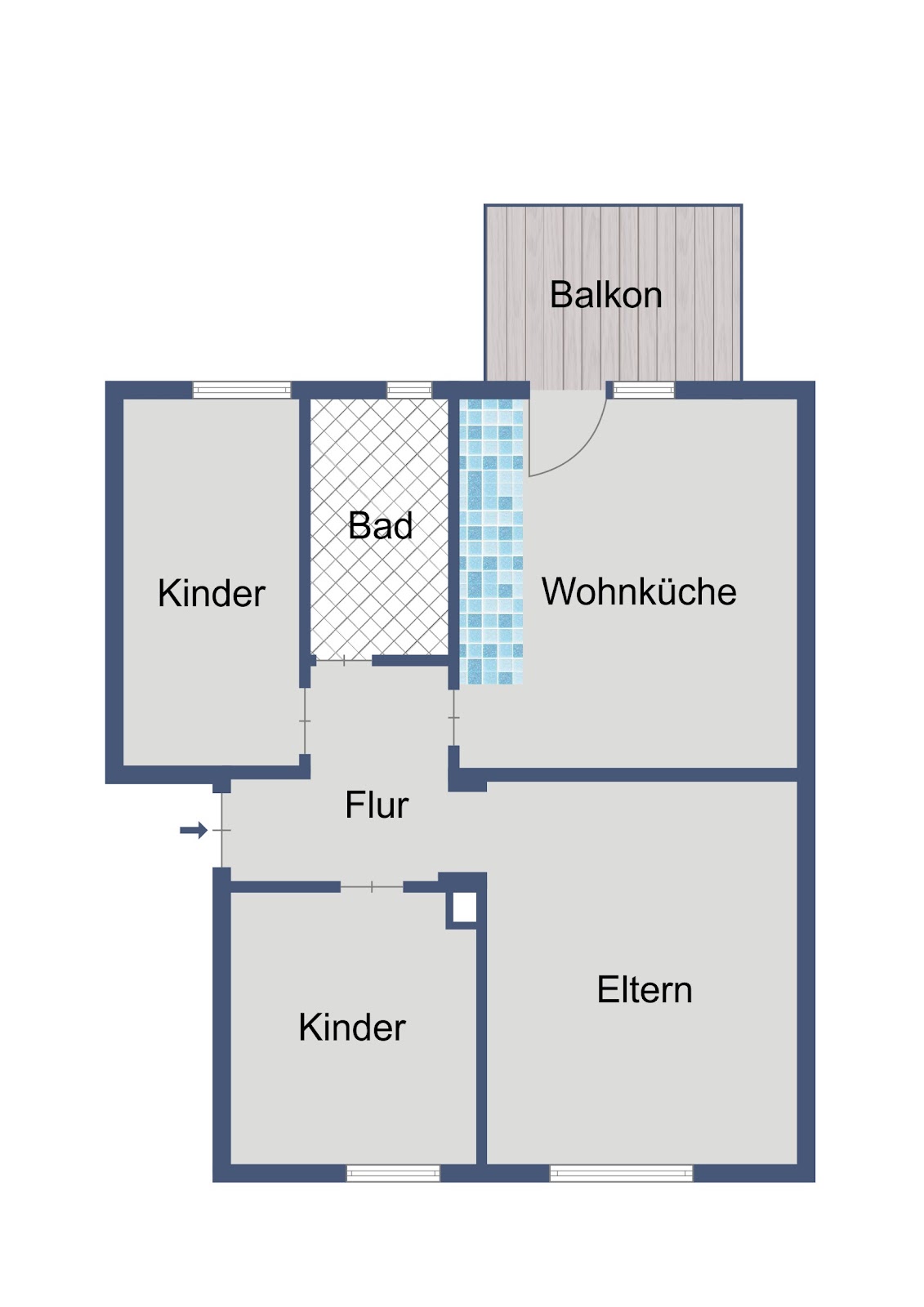 Die großzügige Wohnküche ist hell und freundlich gestaltet und lädt zum Entspannen ein. Von hier aus gelangen Sie auf den Balkon, der zusätzlichen Freiraum im Außenbereich bietet. Drei weitere Zimmer bieten flexible Nutzungsmöglichkeiten als Schlafzimmer, Kinderzimmer oder Arbeitszimmer.