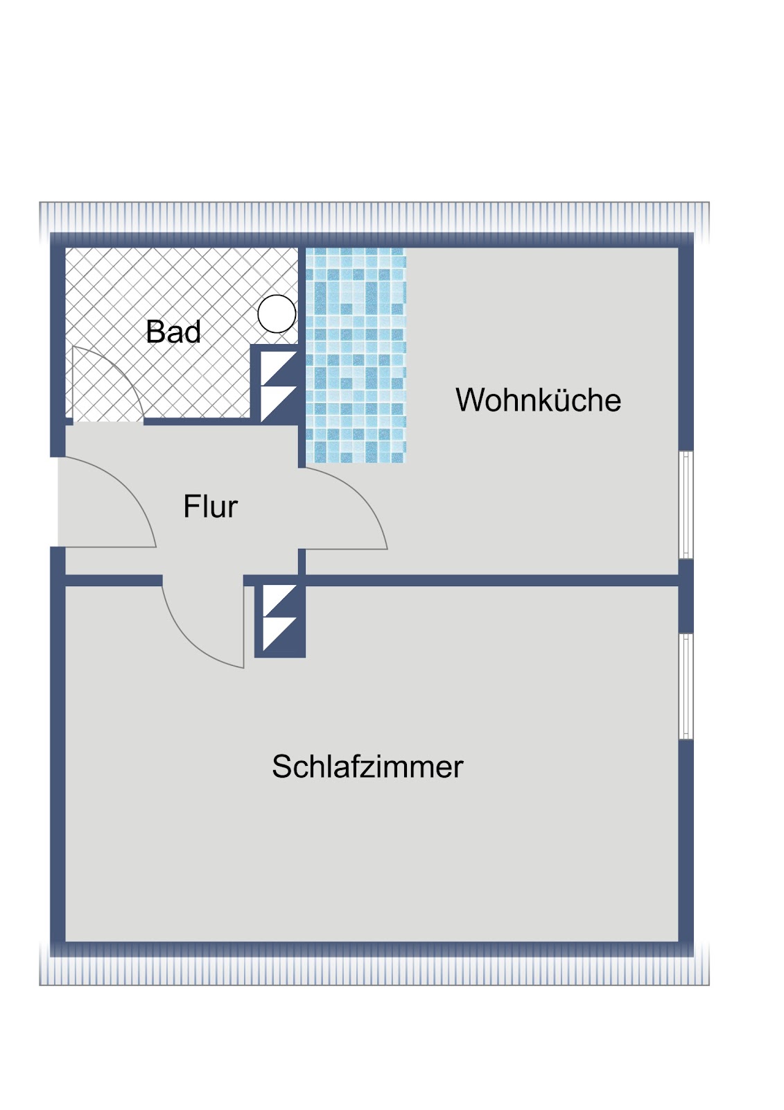 Die Wohnung bietet einen hellen Wohnbereich, der sich flexibel einrichten lässt. Das Schlafzimmer ist separat gelegen und sorgt für eine angenehme Rückzugsmöglichkeit. Große Fenster schaffen eine freundliche Wohnatmosphäre.