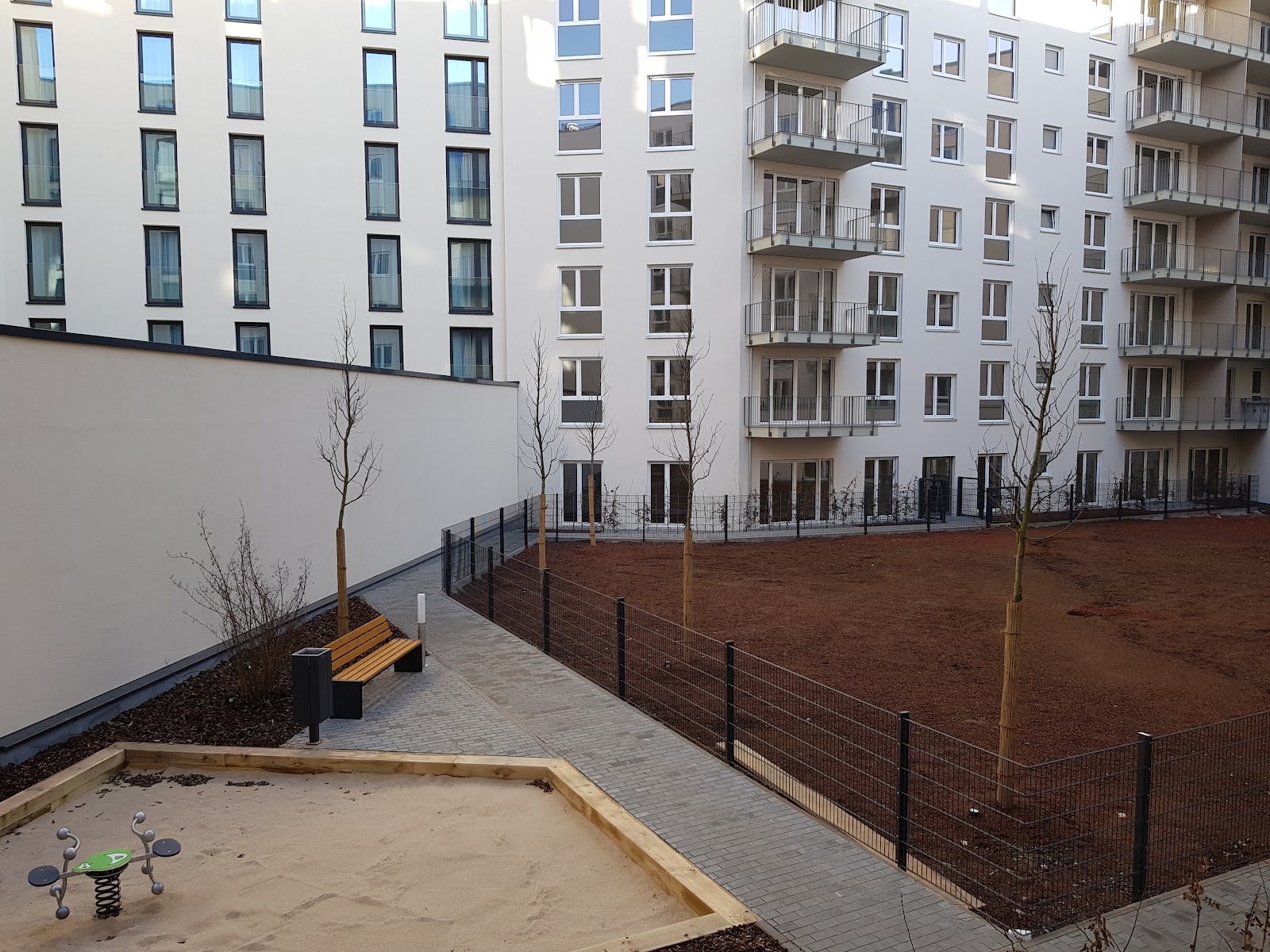 Kindergarten und Kitas (eine davon direkt im Wohngebäude), Grundschule mit Ganztagsbetreuung, Spielplätze, Sporthalle, Rebstockpark und Rebstockbad in unmittelbarer Nähe.