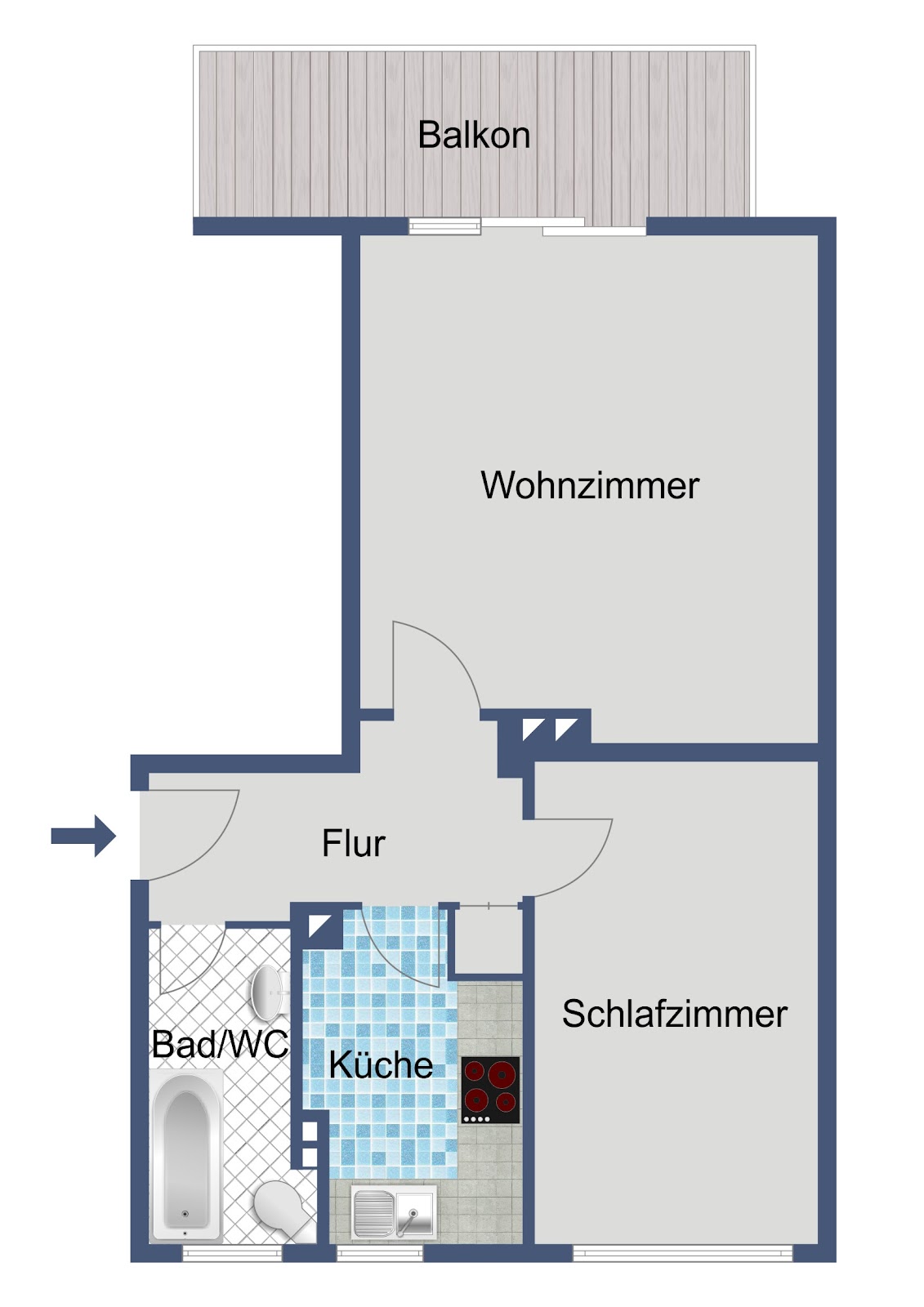 Der praktisch geschnittene Flur verbindet die einzelnen Räume der Wohnung miteinander. Das Wohnzimmer bietet ausreichend Platz für einen komfortablen Wohnbereich und verfügt über den Zugang zu einem Balkon, der den Wohnraum nach außen erweitert und eine angenehme Möglichkeit zum Aufenthalt im Freien bietet. Das Schlafzimmer eignet sich gut als ruhiger Rückzugsort. Die Küche ist funktional gestaltet und bietet Raum für die tägliche Zubereitung von Mahlzeiten. Das Badezimmer ist mit einer Badewanne ausgestattet. Ein Kellerraum steht als zusätzlicher Stauraum zur Verfügung und bietet Platz für Gegenstände, die nicht täglich benötigt werden.