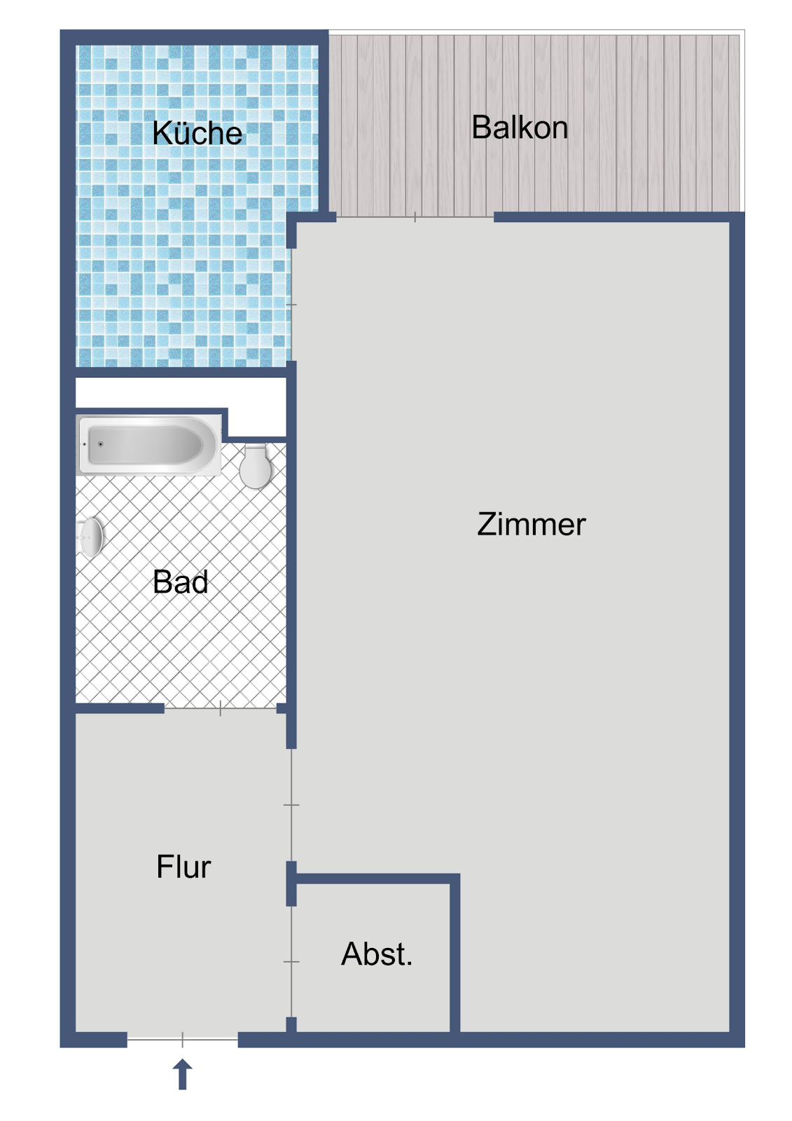 Der Wohn- und Schlafbereich ist offen gestaltet und lässt sich flexibel möblieren, sodass ein kombinierter Wohn-, Arbeits- und Schlafbereich realisiert werden kann. Vom Zimmer aus gelangen Sie auf den Balkon, der zusätzlichen Freiraum im Außenbereich bietet und die Wohnung sinnvoll ergänzt. Die Küche ist separat angeordnet und kann funktional eingerichtet werden, sodass der Kochbereich klar vom Wohnbereich getrennt ist. Das Badezimmer ist mit einer Badewanne ausgestattet und verfügt über alle notwendigen Sanitärelemente für den täglichen Komfort.