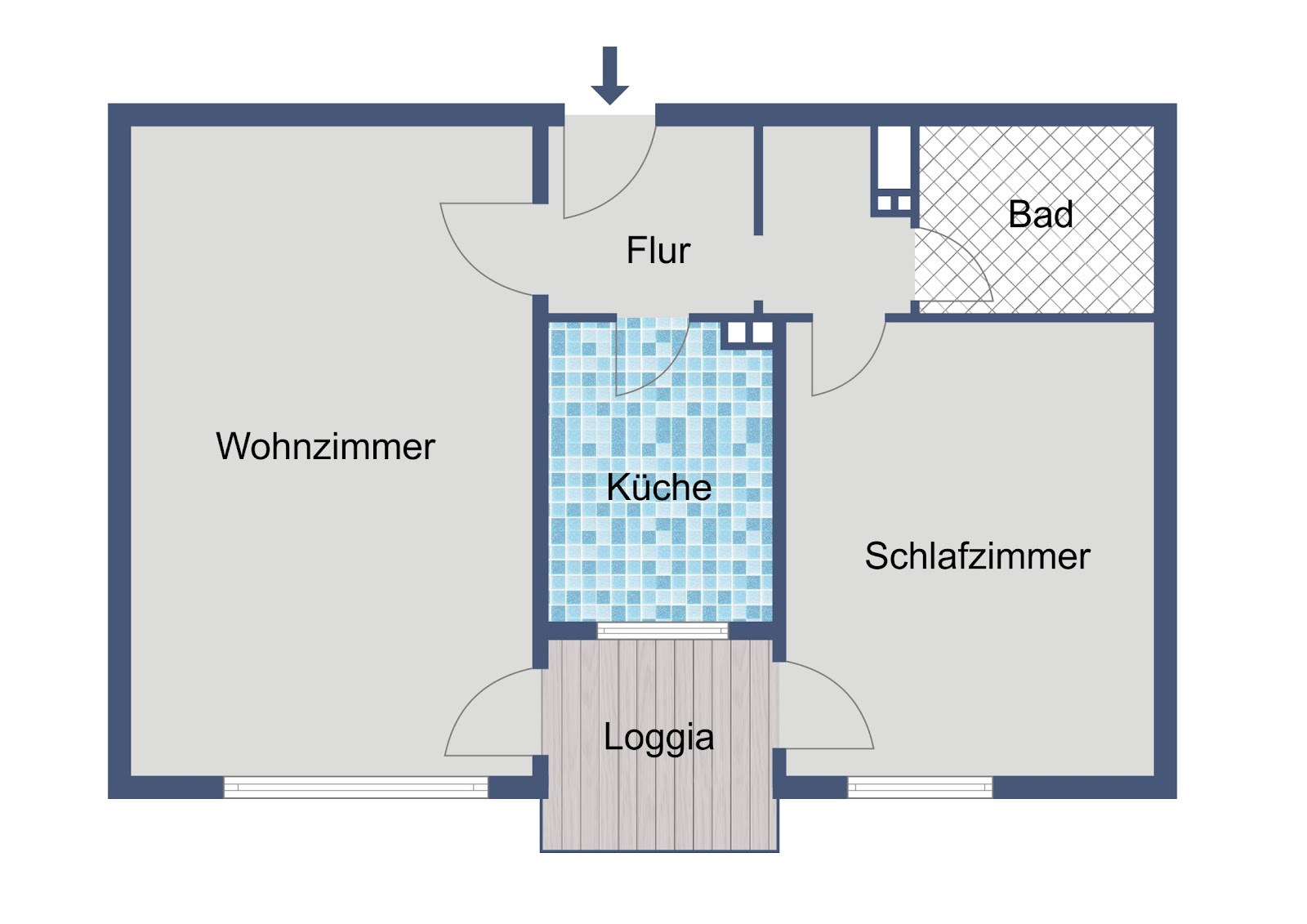 Der zentrale Wohnbereich bietet ausreichend Platz für einen gemütlichen Wohn- und Essbereich und bildet den Mittelpunkt der Wohnung. Das Schlafzimmer ist praktisch geschnitten und ermöglicht eine angenehme Einrichtung mit Bett und Kleiderschrank. Die Küche wird neutral erwähnt und bietet Raum für eine zweckmäßige Nutzung nach Ihren Vorstellungen. Das Badezimmer ist mit einer Badewanne ausgestattet. Ein Flur verbindet die einzelnen Räume sinnvoll miteinander und sorgt für eine klare Struktur der 2-Zimmer-Wohnung. Vom Wohnbereich aus gelangen Sie auf den Balkon, der Ihnen zusätzlichen Platz im Freien bietet.