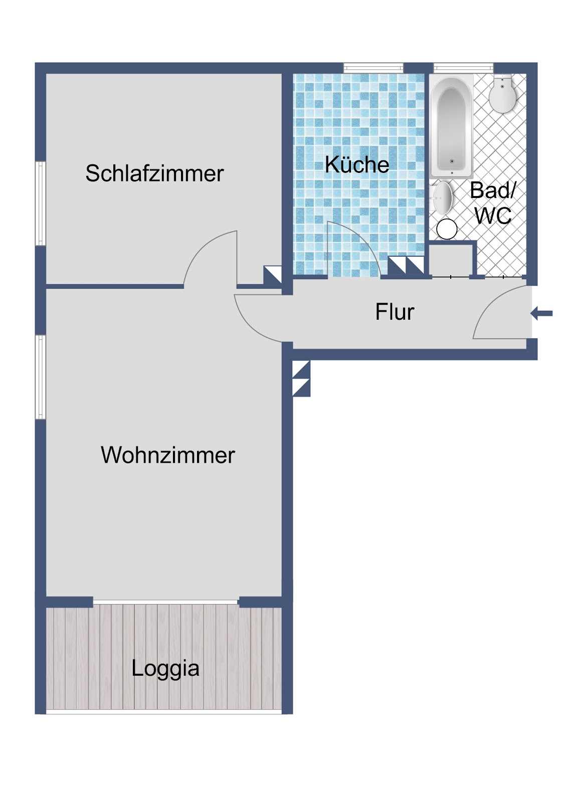 Das Schlafzimmer ist zweckmäßig geschnitten und eignet sich ideal als ruhiger Rückzugsort. Die Küche bietet Raum für eine funktionale Einbauküche und eine alltagstaugliche Nutzung. Das Badezimmer ist mit einer Badewanne ausgestattet und verfügt über einen Waschmaschinenanschluss in der Wohnung, was den täglichen Komfort zusätzlich erhöht.