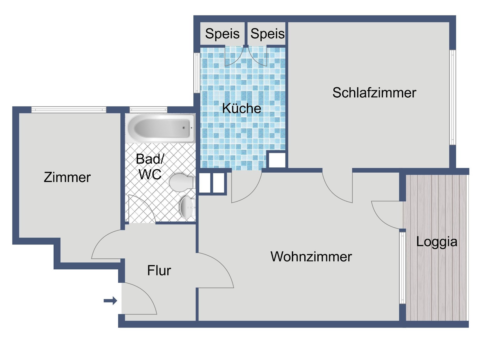 Das Wohnzimmer bildet den zentralen Treffpunkt und öffnet sich zum Balkon, der zusätzlichen Freiraum im Außenbereich bietet. Das Schlafzimmer bietet angenehme Ruhe und ausreichend Platz für ein großes Bett und Stauraum. Ein weiteres Zimmer eignet sich flexibel als Kinderzimmer oder Arbeitszimmer. Die Küche ist vorhanden und ermöglicht eine praktische Alltagsnutzung, ohne besondere Ausstattungsvorgaben.
