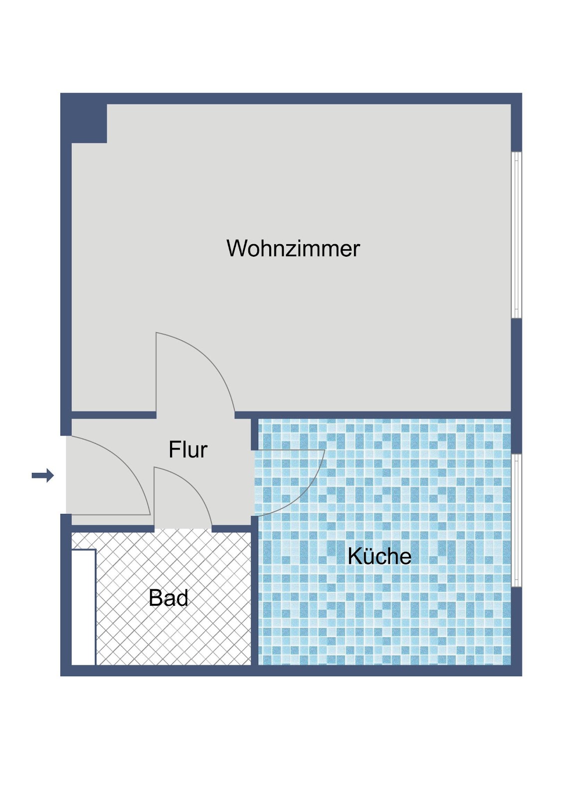 Eine geschlossene Wohnküche sorgt für Gemütlichkeit und eine klare Trennung vom Wohnschlafbereich. Des Weiteren verfügt die Wohnung über ein innenliegendes Badezimmer mit Dusche.