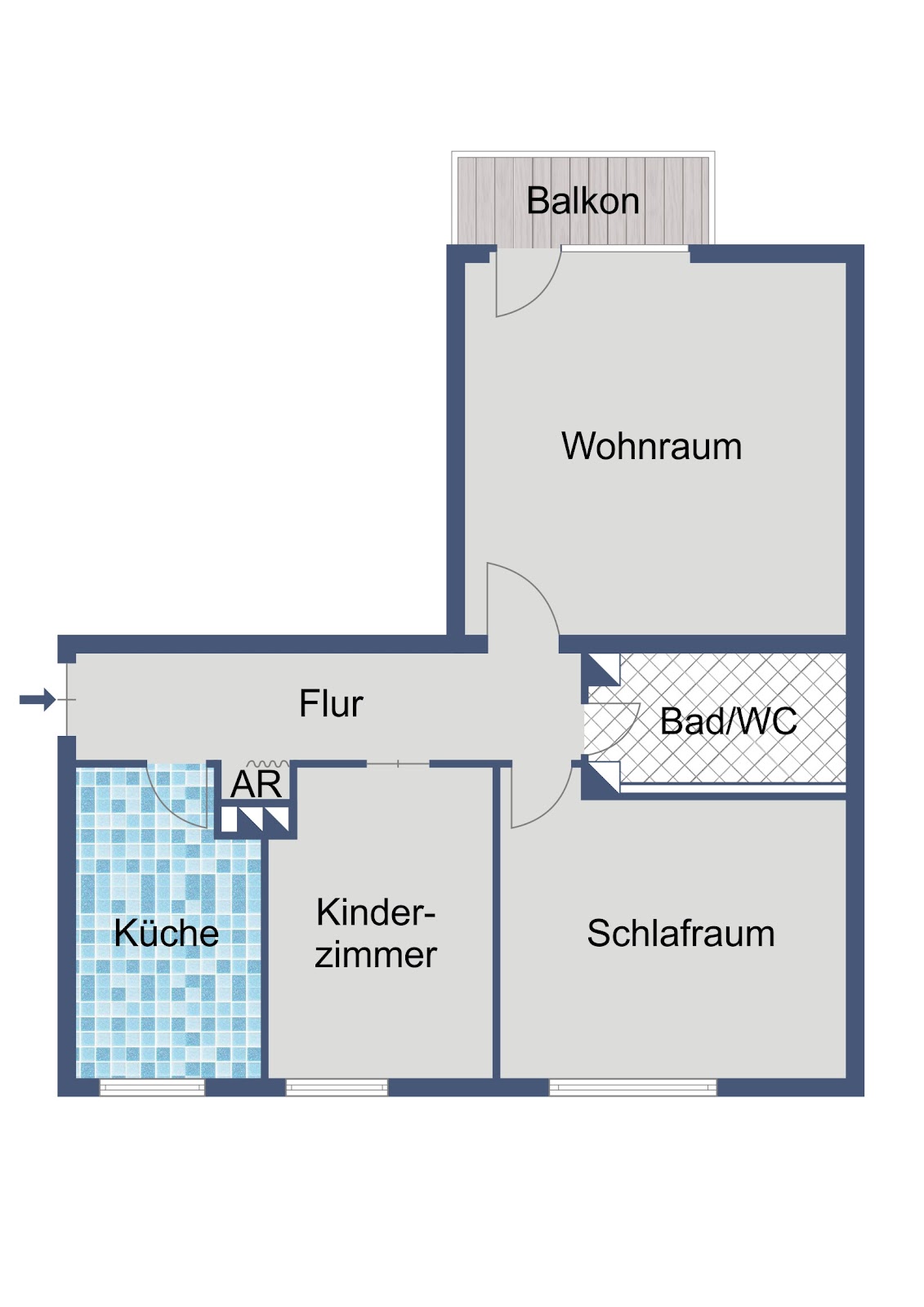 Der Wohnbereich bildet den Mittelpunkt der Wohnung und bietet ausreichend Platz für eine gemütliche Sofaecke sowie einen Essbereich. Vom Wohnzimmer aus gelangen Sie auf den Balkon, der zusätzlichen Freiraum im Außenbereich bietet und den Wohnkomfort insbesondere in den wärmeren Monaten erhöht. Das Schlafzimmer ist gut proportioniert und eignet sich ideal als ruhiger Rückzugsort mit Platz für ein Doppelbett und einen Kleiderschrank. Ein weiteres Zimmer kann flexibel als Kinderzimmer, Arbeitszimmer oder Gästezimmer genutzt werden und macht die Wohnung besonders interessant für Familien oder Berufstätige im Homeoffice. Die Küche ist separat angeordnet und lässt sich funktional nach den eigenen Vorstellungen einrichten. Das Badezimmer ist mit einer Badewanne ausgestattet. Ein Flur verbindet die einzelnen Räume sinnvoll miteinander und schafft einen geordneten Eingangsbereich.
