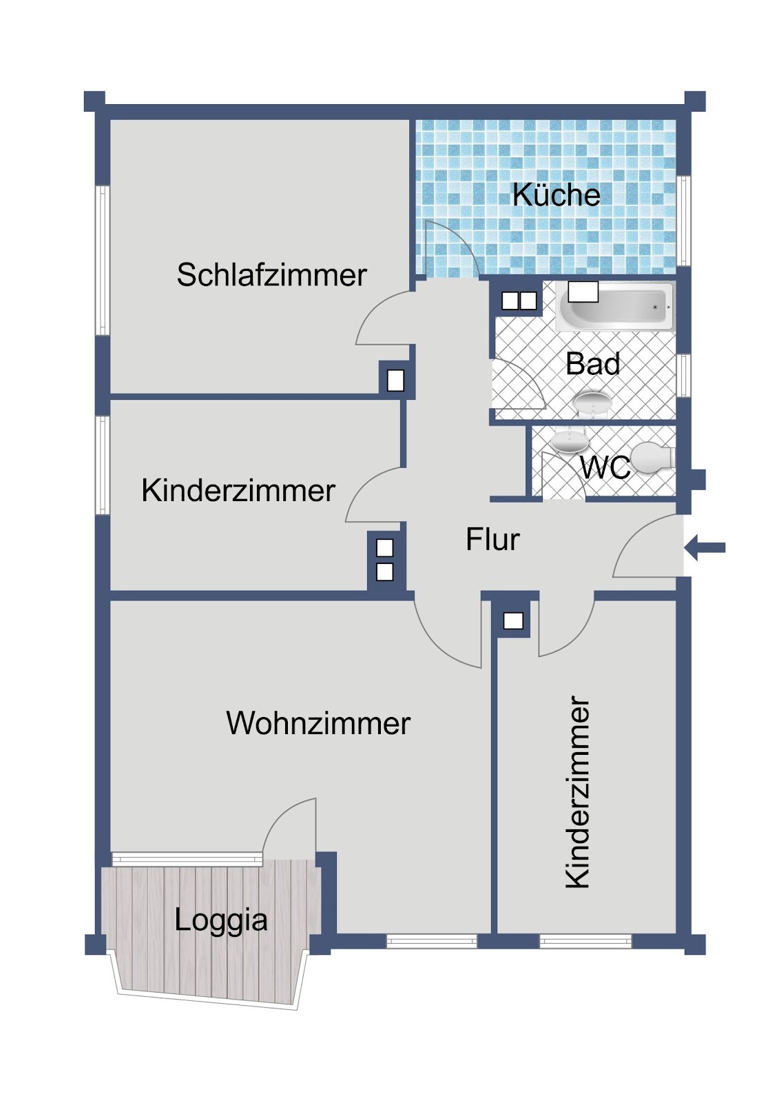 Der Wohnbereich bietet ausreichend Platz für eine gemütliche Wohnlandschaft und einen Essbereich und ist der zentrale Mittelpunkt der Wohnung. Die weiteren Zimmer eignen sich je nach Bedarf als Schlafzimmer, Kinderzimmer oder Arbeitszimmer und ermöglichen eine flexible Nutzung. Die Loggia erweitert den Wohnbereich nach außen und bietet einen angenehmen Platz zum Verweilen.