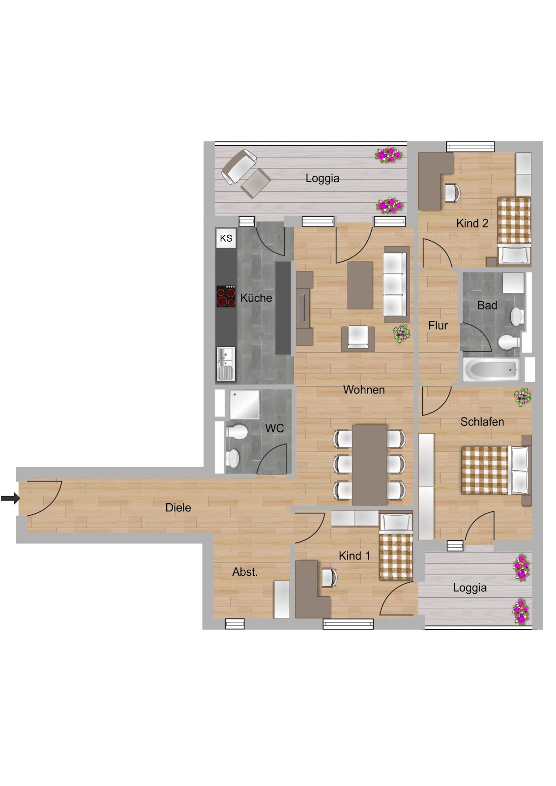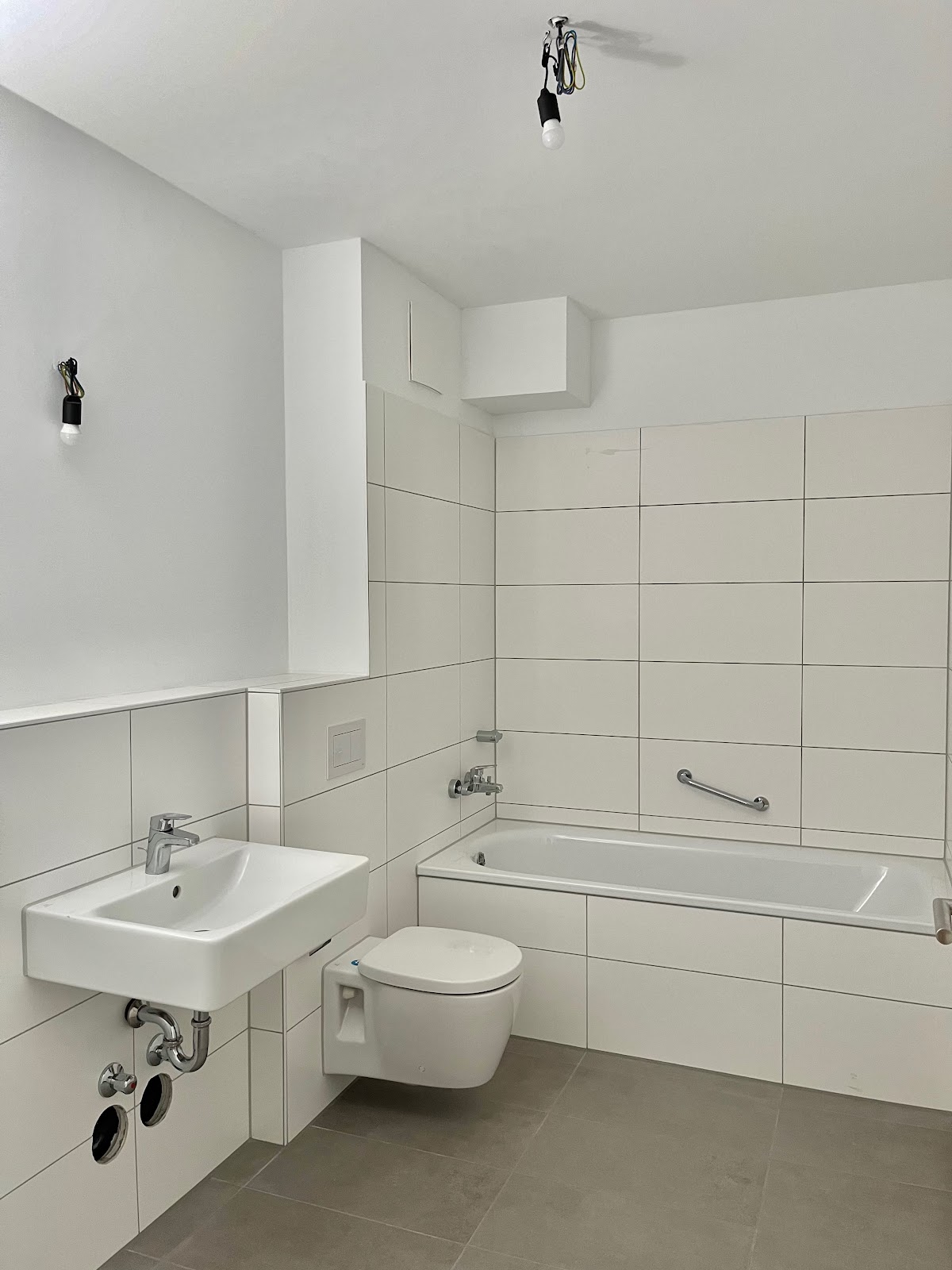 Die Küche ist separat angeordnet beziehungsweise sinnvoll in den Wohnbereich integrierbar und lässt sich funktional nach den eigenen Vorstellungen einrichten. Drei weitere Zimmer stehen als Schlafzimmer, Kinderzimmer oder Arbeitszimmer zur Verfügung und ermöglichen eine flexible Nutzung je nach Lebenssituation. Das moderne Badezimmer ist mit Badewanne und Dusche ausgestattet und bietet damit hohen Komfort im Alltag. Ergänzt wird das Raumangebot durch ein separates Gäste-WC, das besonders für Familien und bei Besuch sehr praktisch ist.
