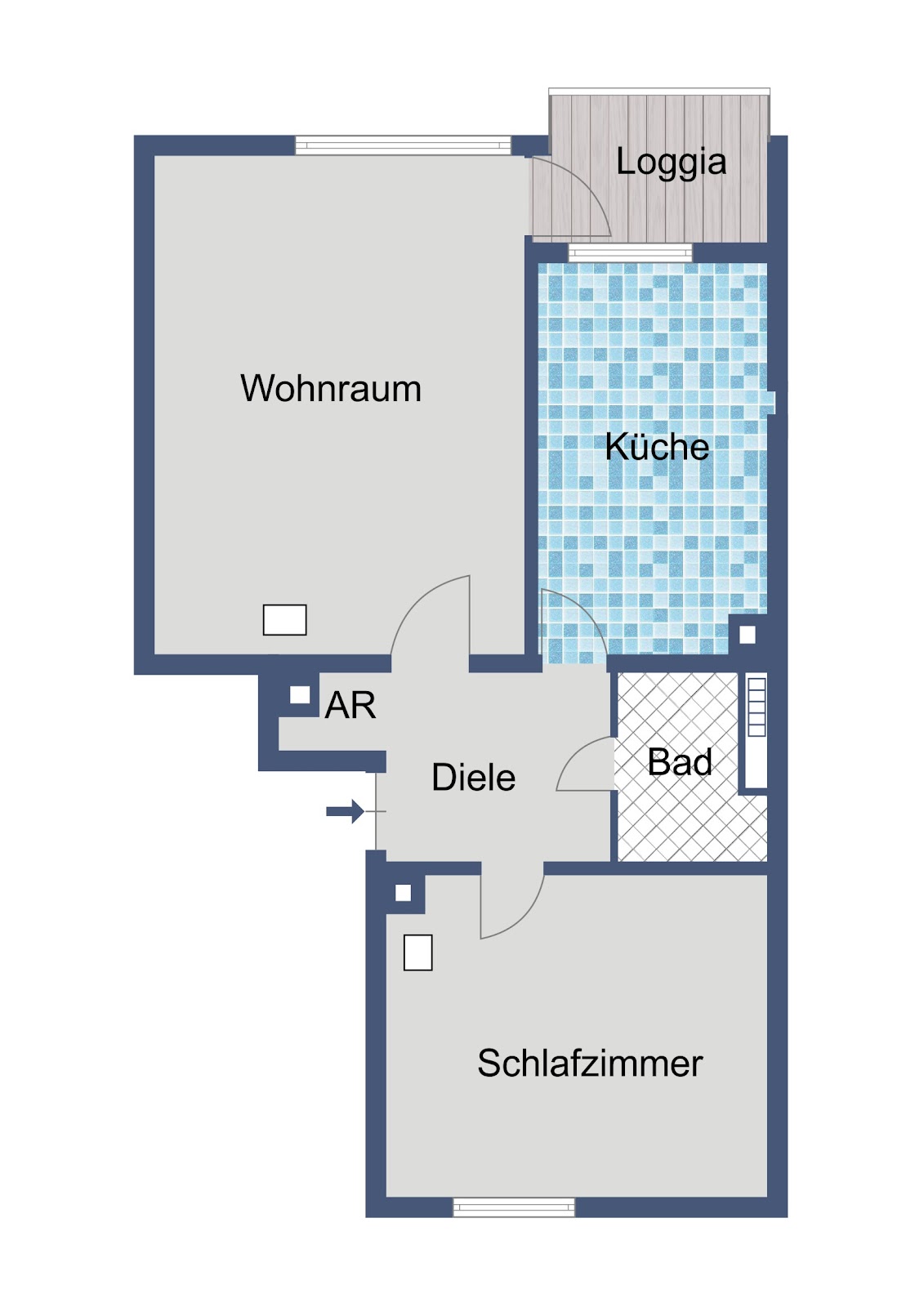 Der durchdachte Grundriss umfasst ein helles Wohnzimmer, von dem aus Sie auf die Loggia gelangen, die zusätzlichen Freiraum im Außenbereich bietet.