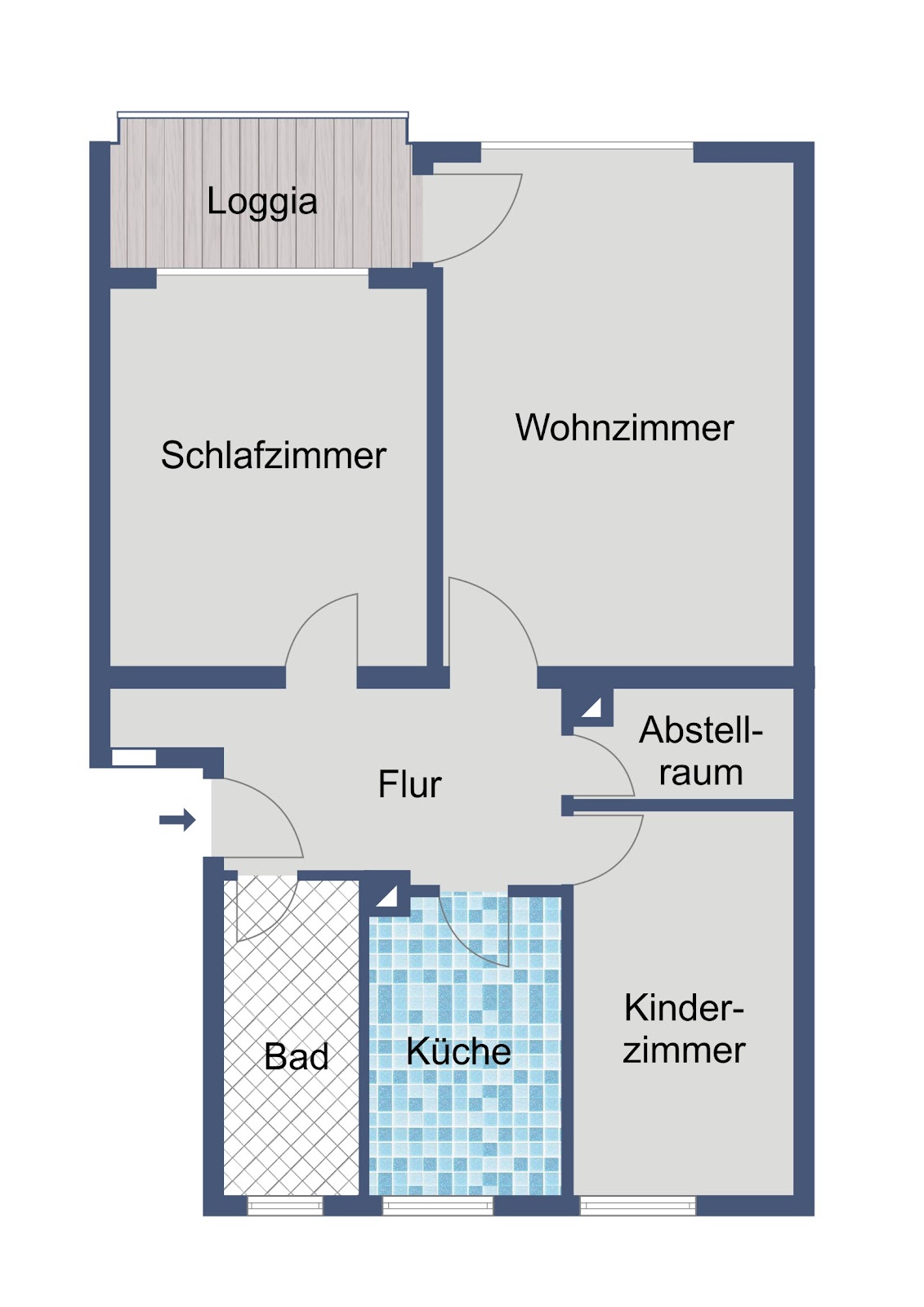 Ein zentraler Flur verbindet die Räume und sorgt für eine klare und gut nutzbare Raumstruktur. Ein Abstellraum in der Wohnung bietet zusätzlichen Stauraum für Alltagsgegenstände.