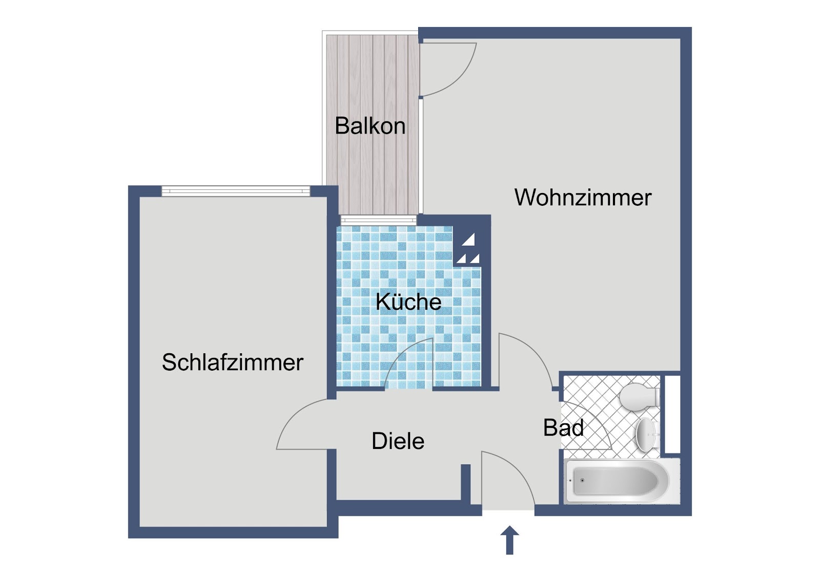 Beim Betreten der Wohnung gelangen Sie in einen zweckmäßig geschnittenen Flur, von dem aus alle weiteren Räume bequem erreichbar sind. Das Wohnzimmer bildet den zentralen Aufenthaltsbereich und bietet Platz für eine gemütliche Sofaecke sowie einen Essbereich. Von hier aus gelangen Sie auf den Balkon, der zusätzlichen Freiraum im Außenbereich schafft und insbesondere in den oberen Etagen einen angenehmen Ausblick bietet. Das Schlafzimmer ist als ruhiger Rückzugsort angelegt und bietet geeignete Stellflächen für ein Bett und einen Kleiderschrank. Die Küche ist separat angeordnet und für den täglichen Gebrauch gut nutzbar, unabhängig davon, ob eine kompakte oder etwas umfangreichere Küchenausstattung vorgesehen ist. Das Badezimmer ist mit einer Badewanne ausgestattet und bietet eine komfortable Grundausstattung für den Alltag. Ein zur Wohnung gehörender Kellerraum sorgt für zusätzlichen Stauraum, zum Beispiel für saisonale Gegenstände oder selten genutzte Utensilien. Der vorhandene Personenaufzug erleichtert den Zugang zur Wohnung im 6. Obergeschoss und erhöht den täglichen Wohnkomfort.