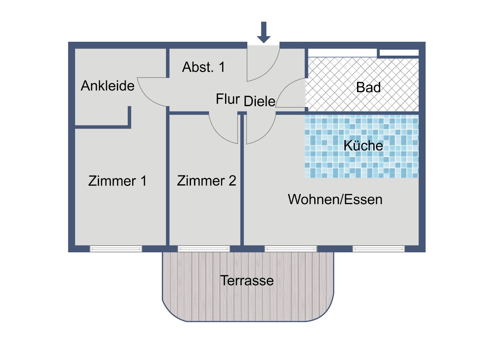 Bereits beim Betreten der Wohnung überzeugt der praktische Grundriss: Vom Flur aus sind alle Räume bequem erreichbar. Gleich auf der linken Seite befindet sich das Badezimmer. Geht man geradeaus, öffnet sich der helle Wohn- und Essbereich mit integrierter Küche, der den zentralen Mittelpunkt der Wohnung bildet und viel Platz für gemeinsames Wohnen und Entspannen bietet.