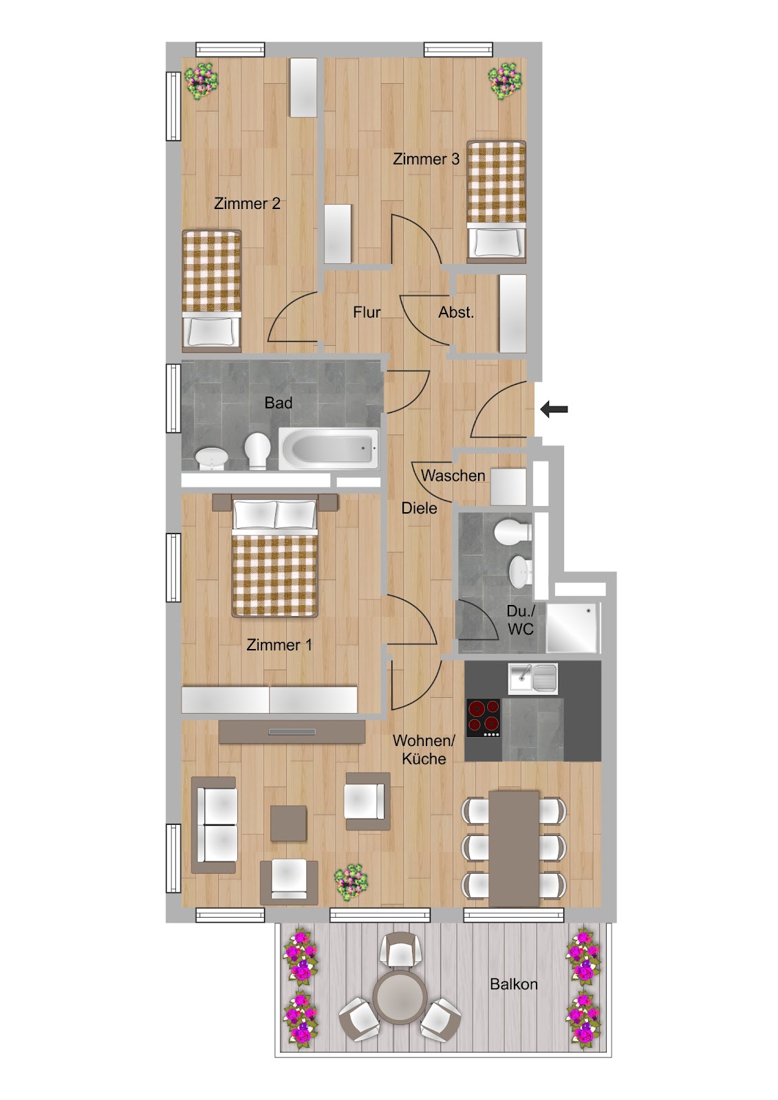 Der helle und großzügig geschnittene Wohnbereich ist Mittelpunkt der Wohnung und wird durch den Austritt auf den Balkon erweitert. Diese bietet Ihnen genügend Platz für eine kleine Sitzecke, die zum Verweilen einlädt.
