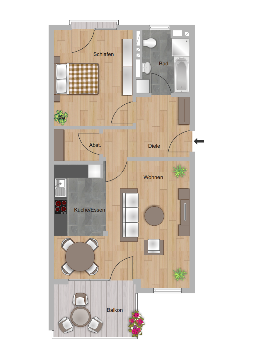 Das Schlafzimmer bietet ausreichend Platz für ein komfortables Bett sowie einen Kleiderschrank und kann je nach Bedarf auch mit einem kleinen Arbeitsbereich kombiniert werden. Das Badezimmer ist modern ausgestattet und verfügt sowohl über eine Badewanne als auch über eine separate Dusche. Ein praktischer Waschmaschinenanschluss innerhalb der Wohnung sorgt für zusätzlichen Komfort im Alltag.