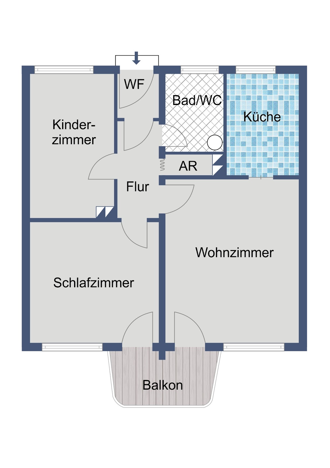Das separate Schlafzimmer sorgt für einen angenehmen Rückzugsort, während ein weiteres Zimmer flexibel als Kinder-, Arbeits- oder Gästezimmer genutzt werden kann. Die Küche ist funktional gestaltet und lässt individuelle Einrichtungsideen zu.