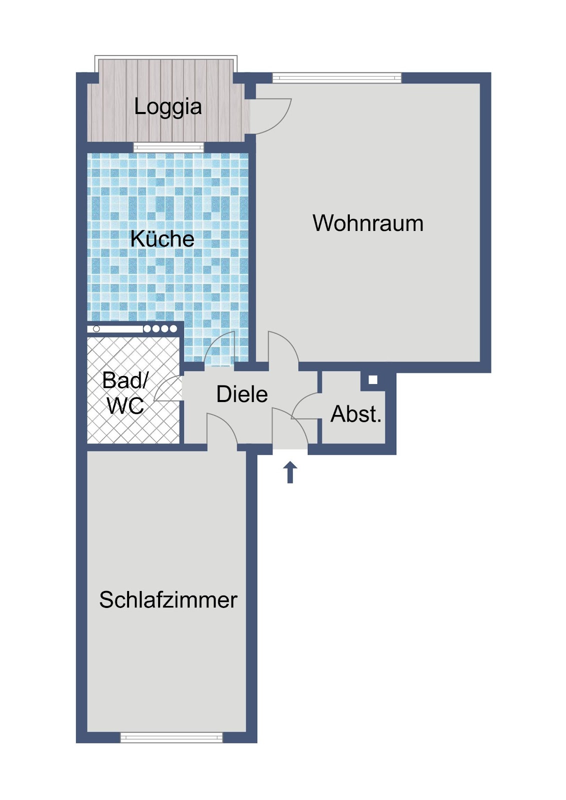 Der Wohnbereich dient als zentraler Mittelpunkt der Wohnung und bietet ausreichend Platz für eine gemütliche Sofaecke, einen Medienbereich sowie einen Essplatz. Vom Wohnzimmer aus gelangen Sie direkt auf den Balkon, der an wärmeren Tagen einen angenehmen Aufenthalt im Freien ermöglicht und zusätzlichen Wohnkomfort bietet. Das Schlafzimmer ist separat angeordnet und bietet genügend Raum für ein Bett und einen Kleiderschrank, sodass ein ruhiger Rückzugsort entsteht. Die Küche ist funktional geschnitten und ermöglicht die Einrichtung einer zweckmäßigen Küchenzeile mit den üblichen Küchengeräten.