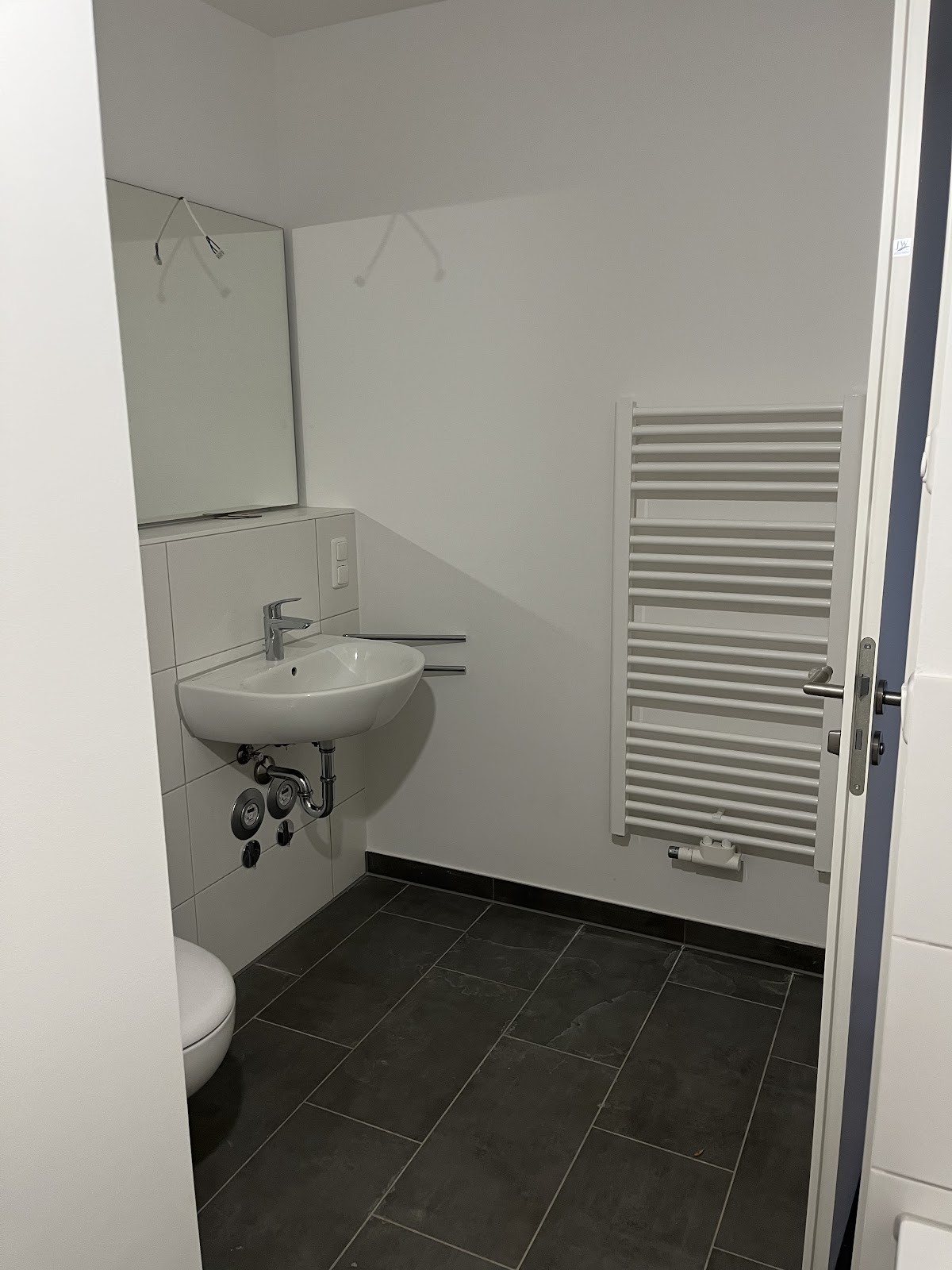 Die Badezimmer sind modern gestaltet: Anthrazitfarbene Bodenfliesen, weiße Wandfliesen und ein Handtuchheizkörper sorgen für zeitlose Eleganz. Je nach Grundriss erwartet Sie eine Badewanne für entspannte Auszeiten oder eine ebenerdige Dusche für einen komfortablen Start in den Tag. Viele Wohnungen verfügen zudem über ein zusätzliches Gäste-WC, was den Alltag besonders angenehm macht.