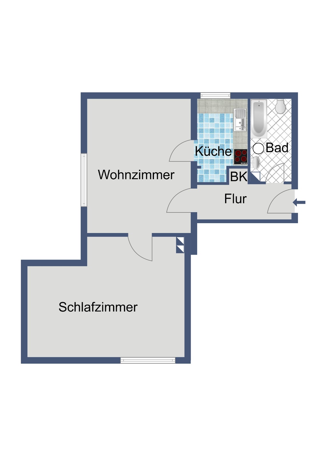 Das Wohnzimmer bildet den Mittelpunkt der Wohnung. Vom Wohnzimmer aus gelangen Sie auf den Balkon, der zusätzlichen Freiraum im Außenbereich bietet. Das Schlafzimmer ist gut proportioniert und eignet sich ideal für erholsame Nächte. Die Küche ist neutral gehalten und bietet Raum für die tägliche Zubereitung von Mahlzeiten. Das Badezimmer ist mit einer Badewanne ausgestattet. Ein funktionaler Flur verbindet die Räume logisch miteinander.