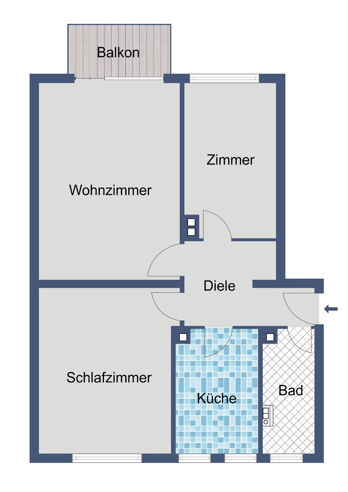 Der praktisch geschnittene Flur verbindet alle wesentlichen Räume der Wohnung miteinander. Das Wohnzimmer bietet ausreichend Platz für einen komfortablen Wohnbereich und verfügt über den Zugang zu einem Balkon, der den Wohnraum nach außen erweitert und eine angenehme Möglichkeit zum Aufenthalt im Freien schafft. Die beiden weiteren Zimmer lassen sich flexibel als Schlafzimmer, Kinderzimmer oder Arbeitszimmer nutzen und ermöglichen eine alltagstaugliche Raumaufteilung. Die Küche ist neutral und funktional gestaltet und eignet sich für die tägliche Zubereitung von Mahlzeiten. Das Badezimmer ist mit einer Badewanne ausgestattet. Ein Kellerraum steht als zusätzlicher Stauraum zur Verfügung und bietet Platz für Gegenstände, die nicht täglich benötigt werden.