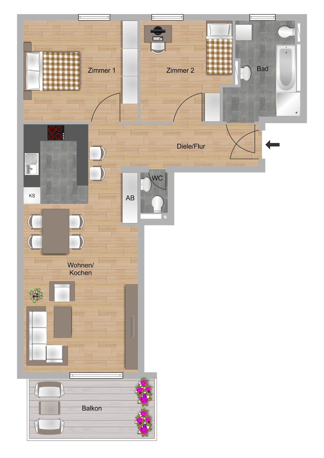 Der Eingangsbereich führt Sie in einen praktisch geschnittenen Flur, von dem alle Räume der Wohnung zugänglich sind. Das Wohnzimmer bietet ausreichend Platz für einen gemütlichen Wohn- und Essbereich und ist offen mit der Küche verbunden, was für ein modernes Wohngefühl sorgt. Von hier gelangen Sie auf den Balkon, der Ihnen zusätzlichen Freiraum im Außenbereich bietet.